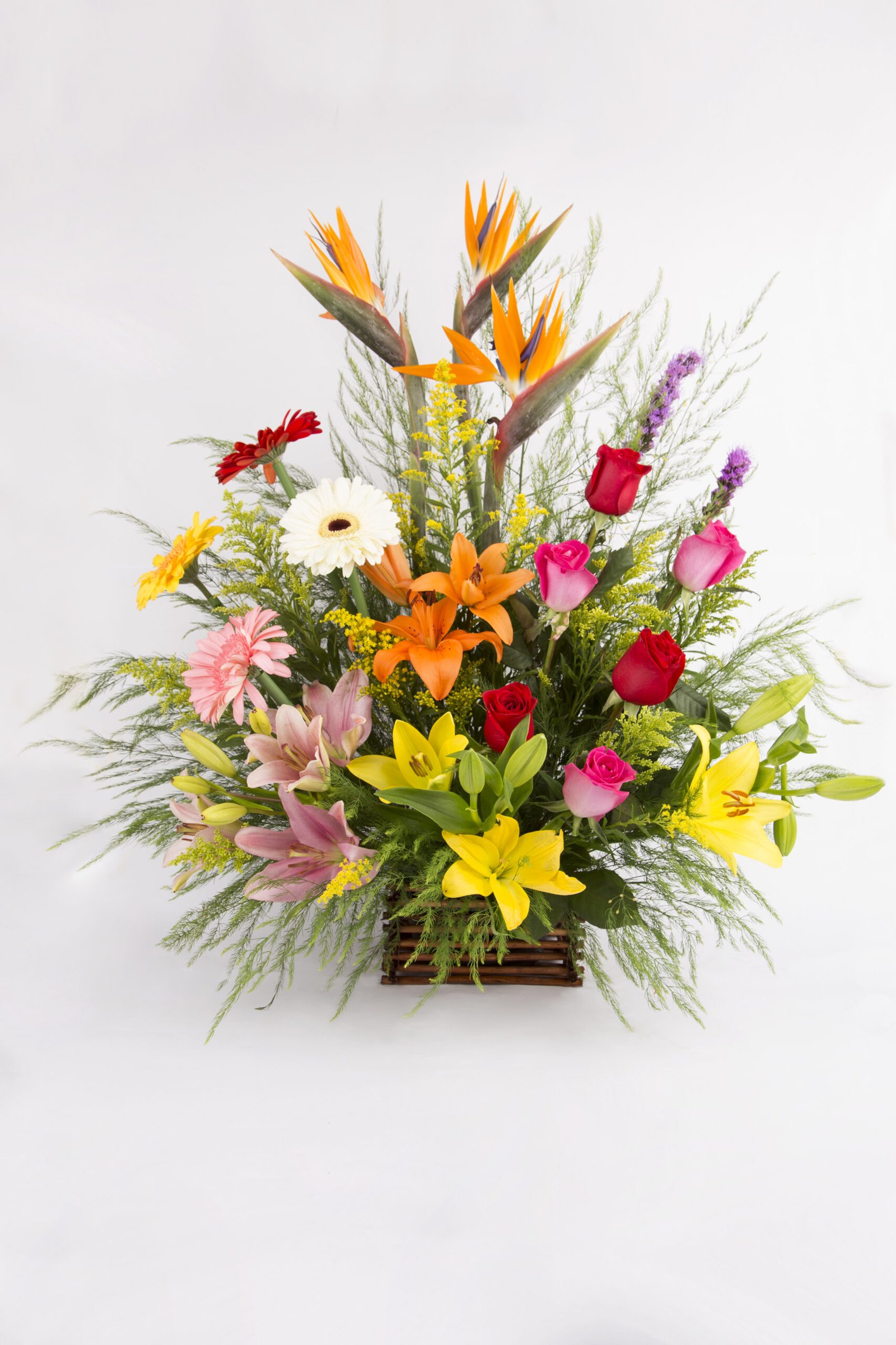 Medidas:80cm alto, 70cm ancho, Flores: Sustido de rosas, aves del paraiso, gerbera, lilis y leatrix, Base: Cónica Café