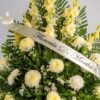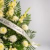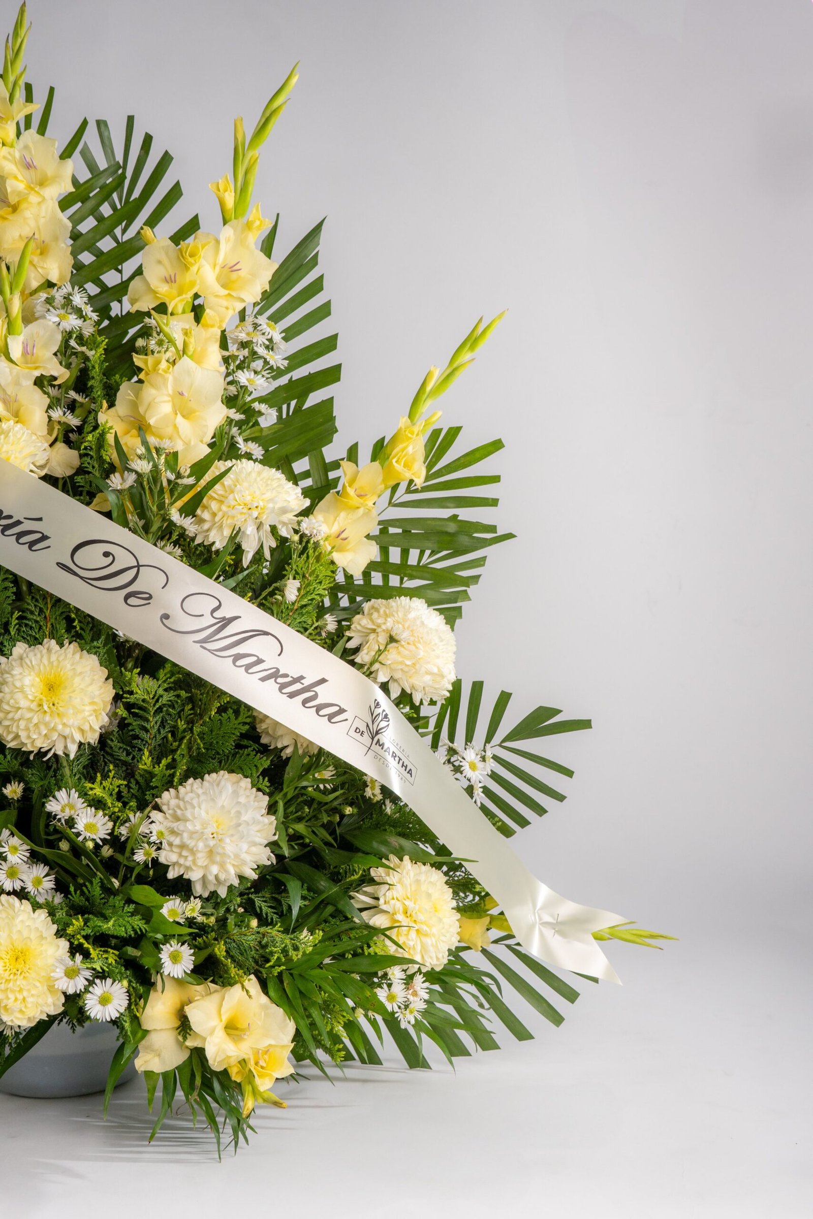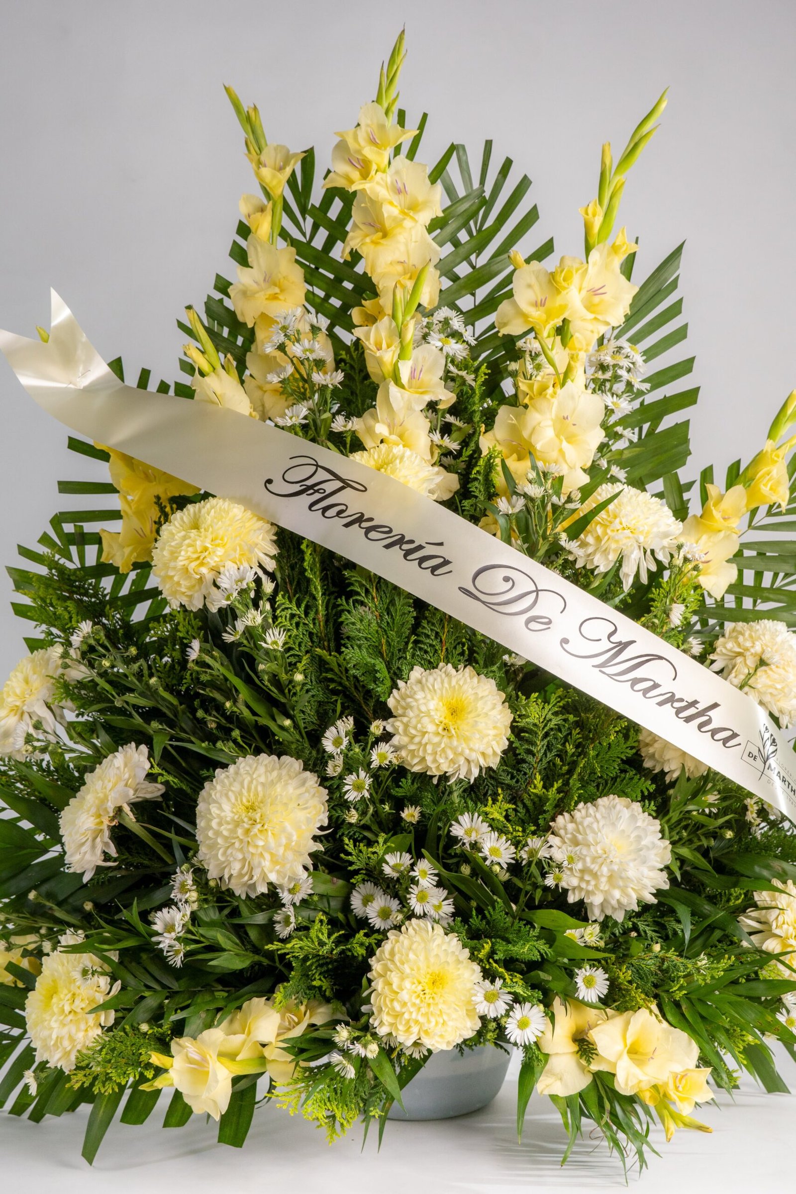 Arreglo especial para eventos fúnebres, adornar iglesias, novenarios e incluso tumbas. Dimensiones: 1 metro de alto x 1.2 metros de ancho. Consiste en: - 12 Gladiolas color Amarillo - 12 Polares.