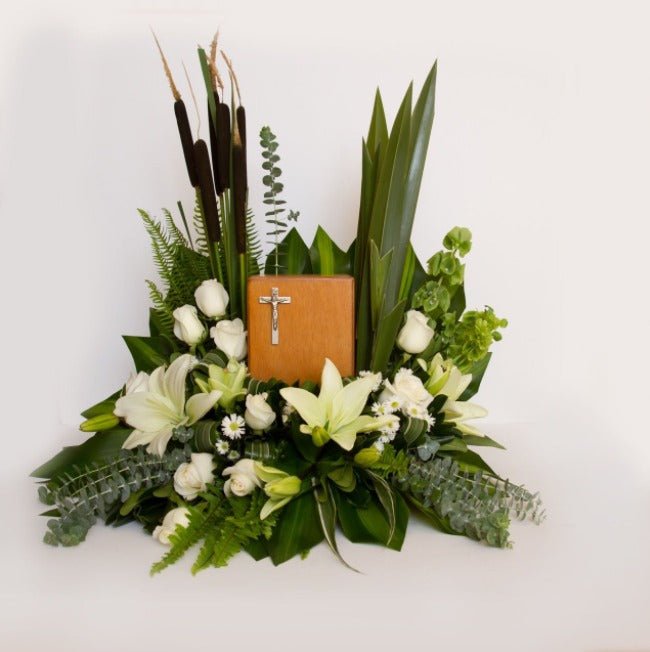 Arreglo para Urna de cenizas*( No incluye Urna ).Medida para Urna estándar.Flores: Rosas blancas, Lilis Blancas.Complemento: varas de Cohetes y Aster Blanco.Follajes: Maicera, Huarneque, mini Dólar, Helecho, Campana Irlandesa , Forneo, Clavo Japonés.