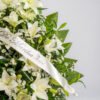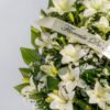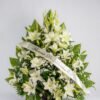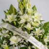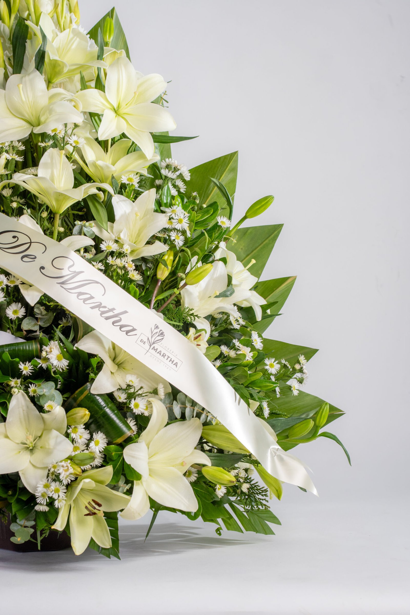 - Contiene los siguientes tipos de flores y follajes: - Lilis Blancas. - Gladiolas Blancas. - Gracenia. - Palma Jumbo. - Aster . - Base Plástica Octagonal Color Chocolate o Blanca.