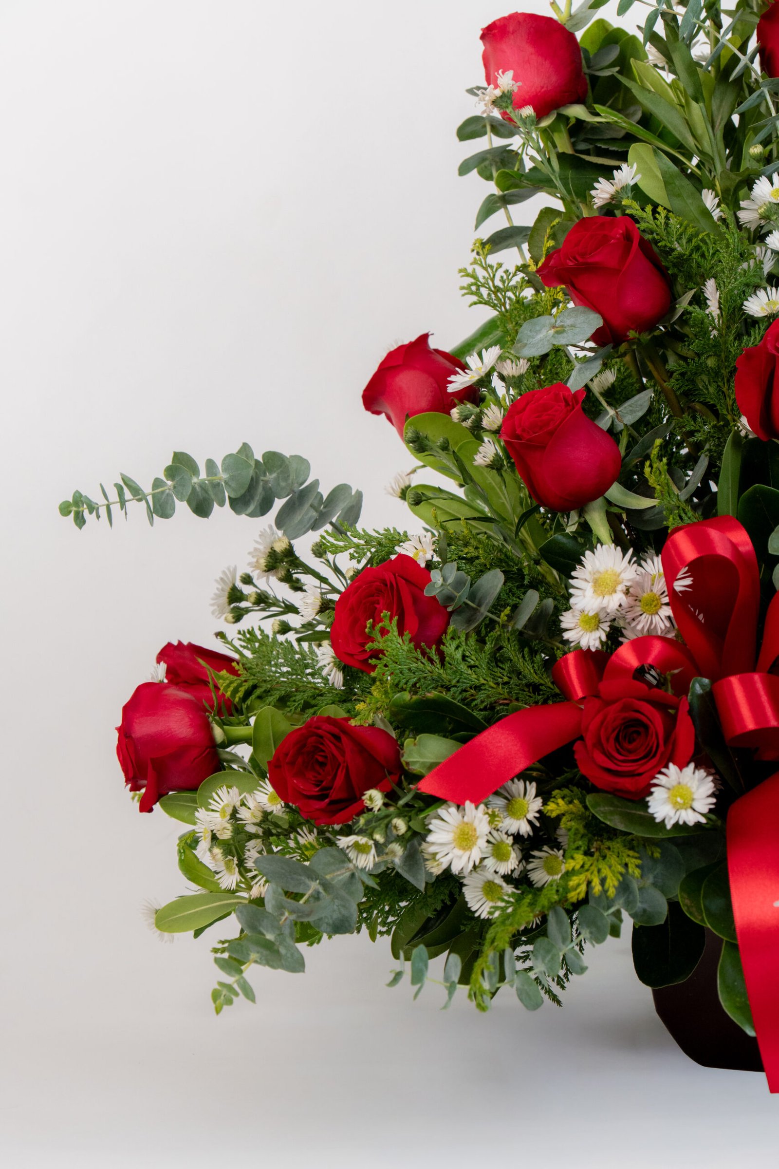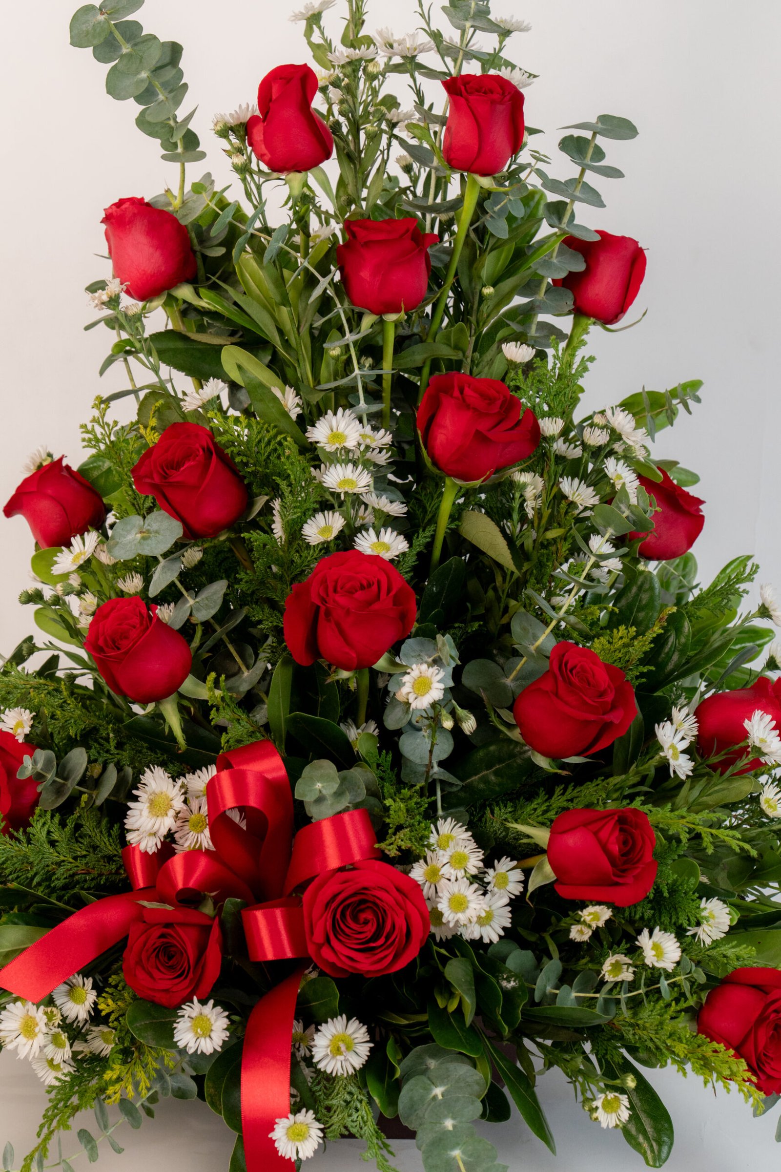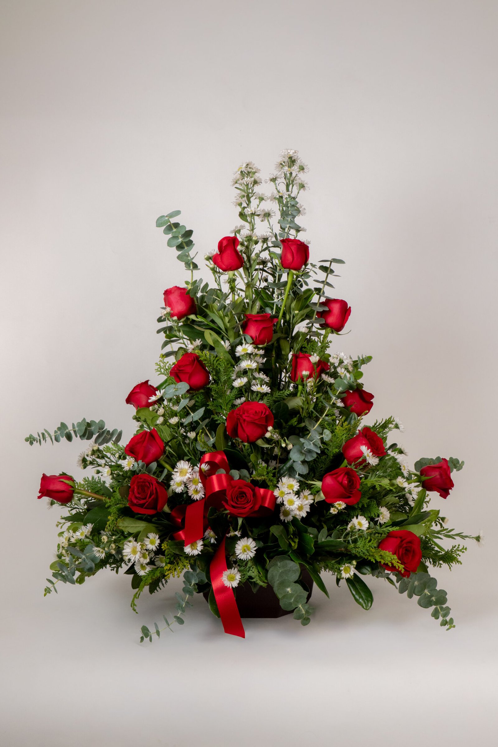 Arreglo de 18 rosas color Rojo, forma tradicional triangular. Follage: Clavo Relleno:Aster Dimensiones: 90 cm de alto, 70 cm. de ancho Base: Huacal Mediano