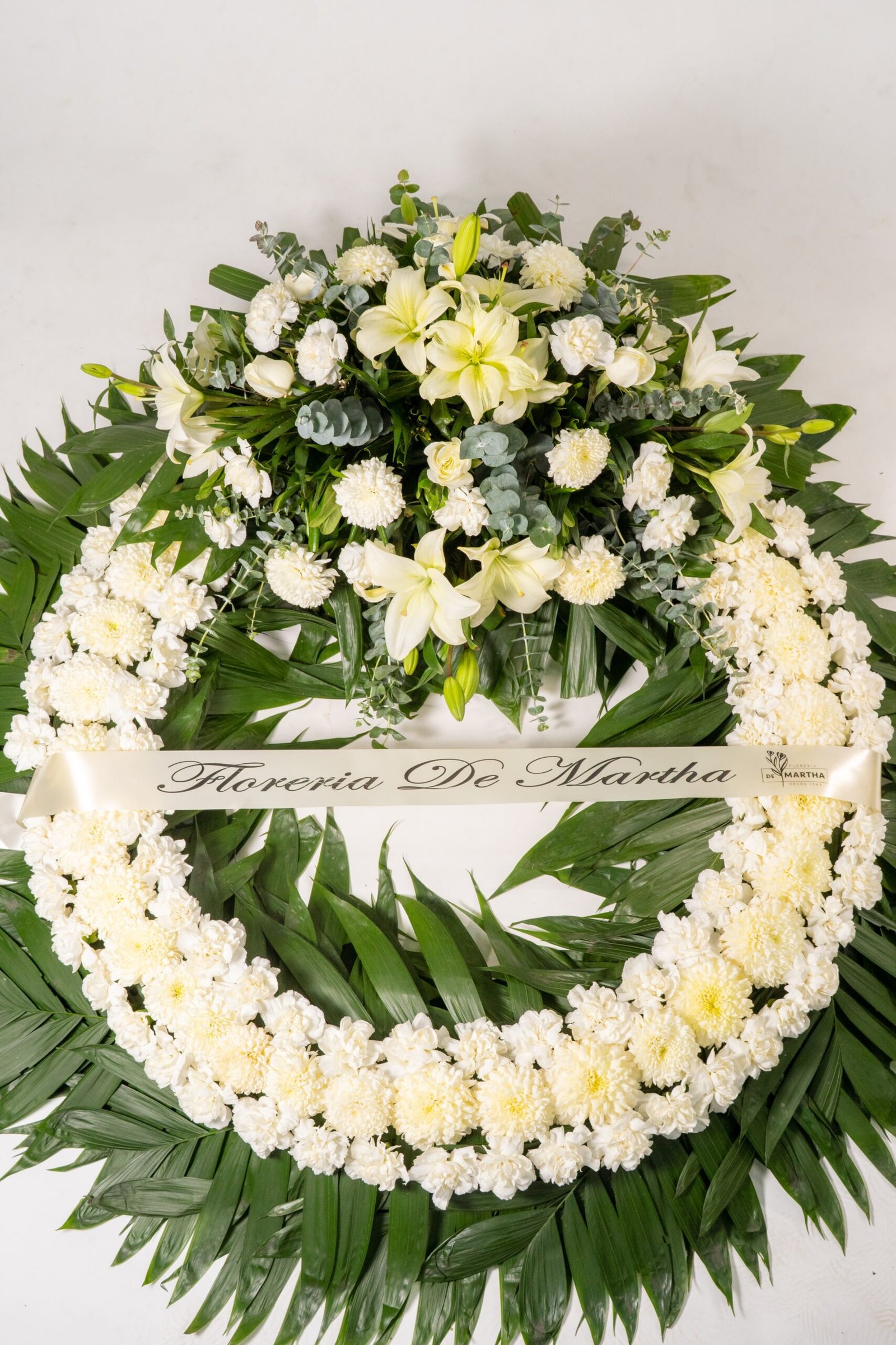 Corona para difunto hecha de Polar blanco y clavel blanco, con su respectivo Copete de polar, clavel, rosa blanca, Lili blanca.