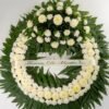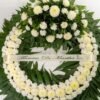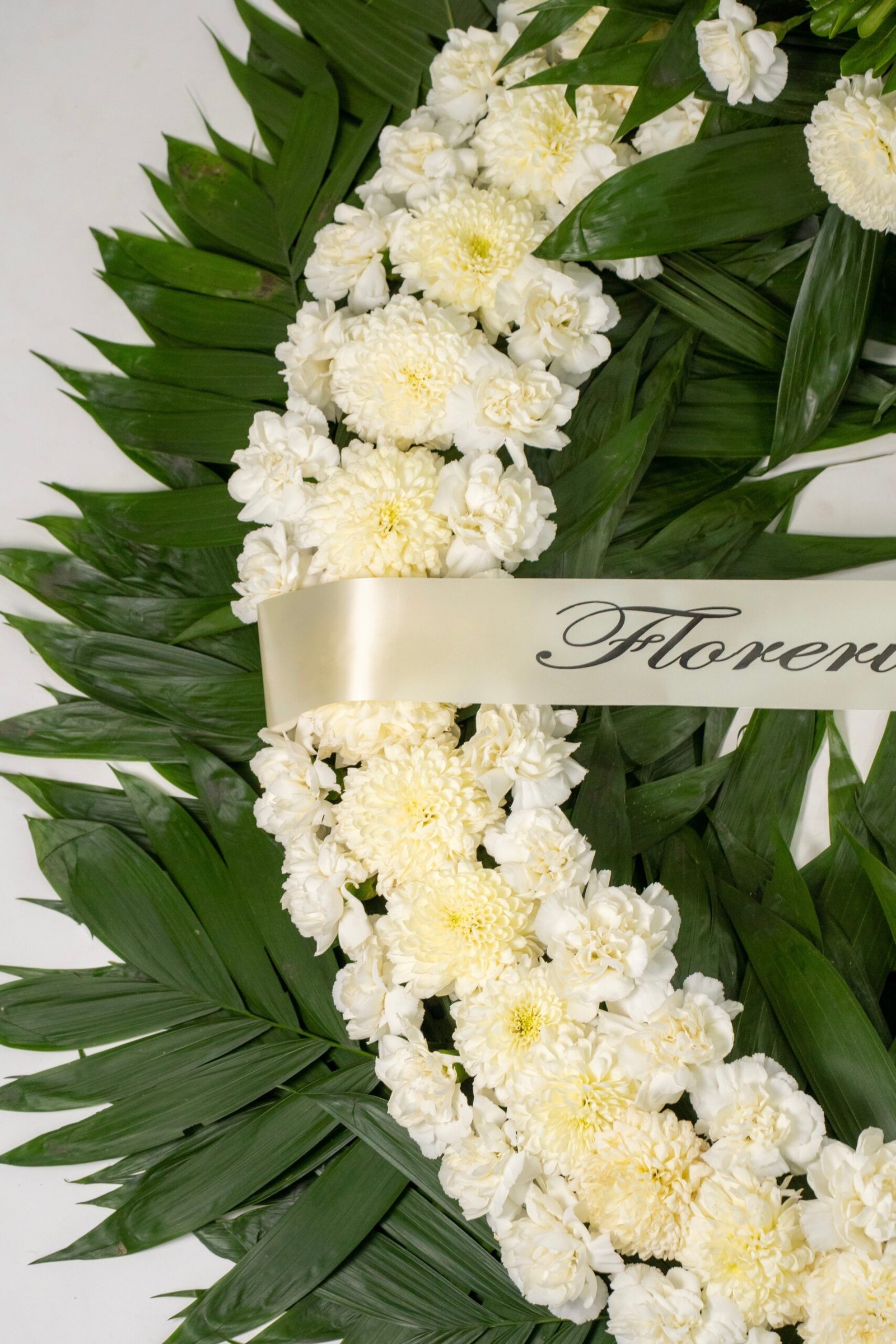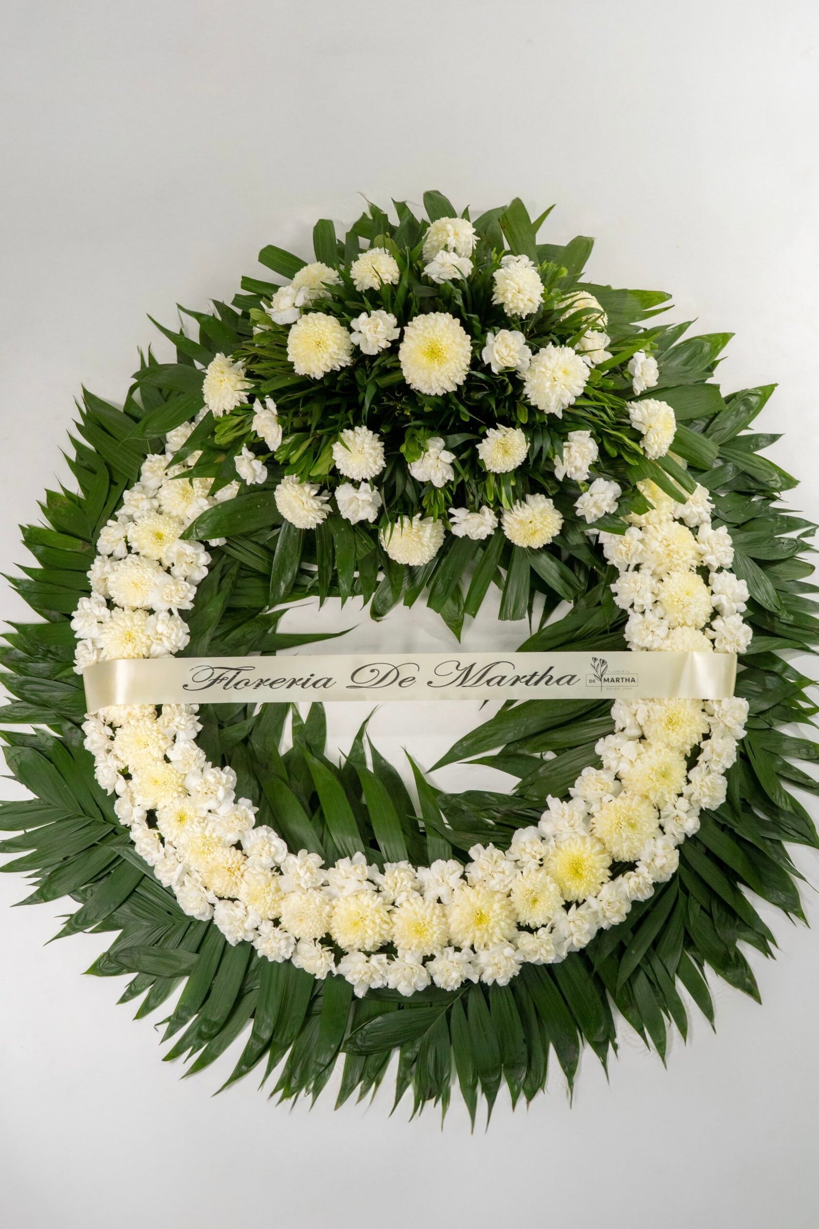 Corona para difunto hecha de Polar blanco y clavel blanco, con su respectivo Copete de adorno. Dimensiones: 1 metro de ancho ( aro ), 1.40 metros de ancho con follaje. Incluye: Tripie de Soporte.