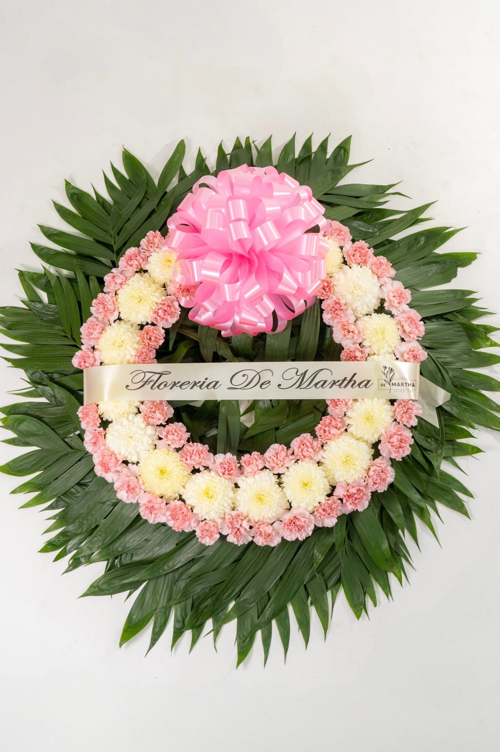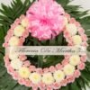 Corona para difunto hecha de Polar blanco y clavel Rosa Pastel, con su respectivo Moño de adorno. Dimensiones: 60 cm de ancho ( aro ), 90 cm de ancho con follaje.
