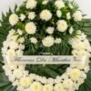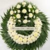 Corona para difunto hecha de Polar blanco y clavel blanco, margarita blanca o polar ramiso con su respectivo Copete de adorno. Dimensiones: 65 cm de ancho ( aro ), 95 cm de ancho con follaje.