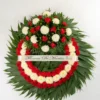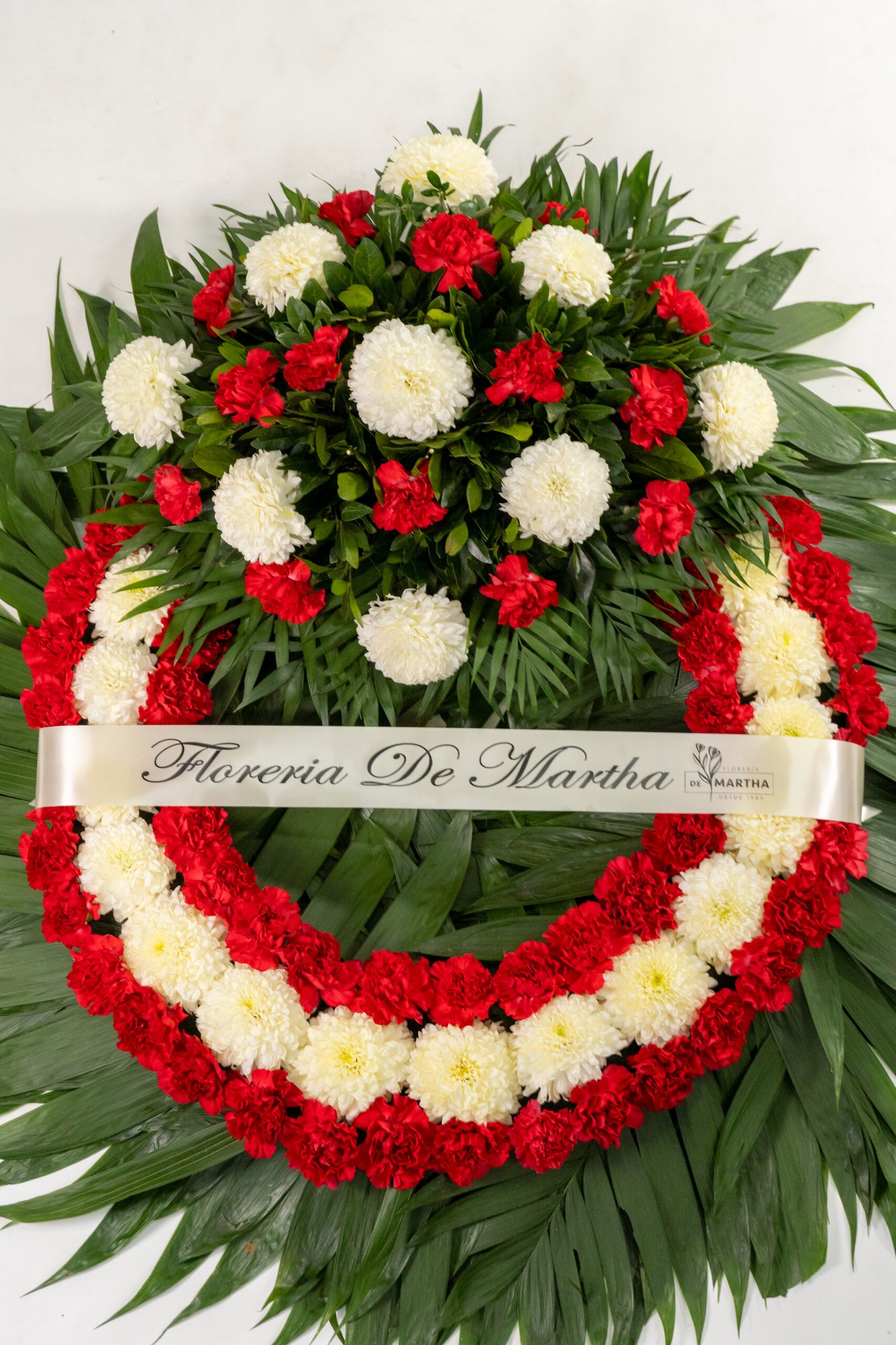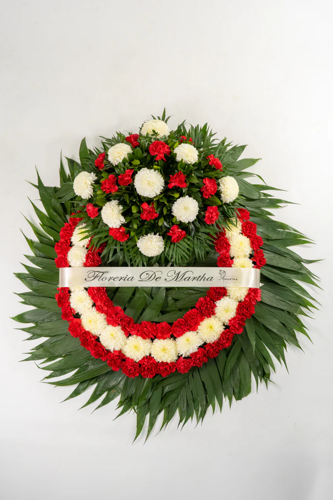 Corona para difunto hecha de Polar blanco y clavel rojo, con su respectivo Copete de adorno. Dimensiones: 65 cm de ancho ( aro ), 95 cm de ancho con follaje.