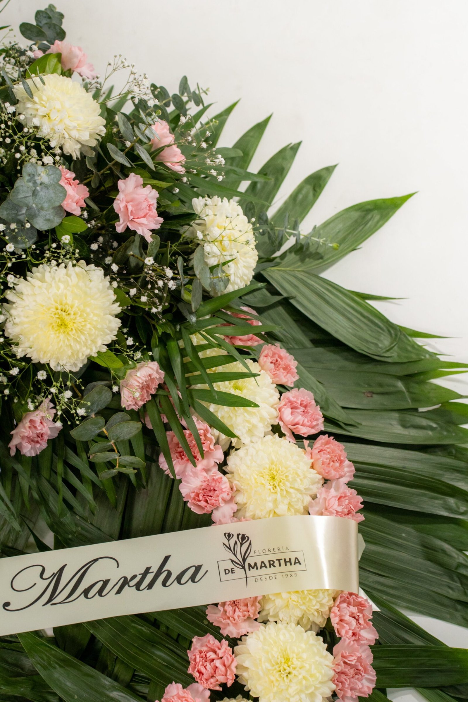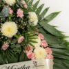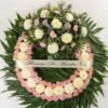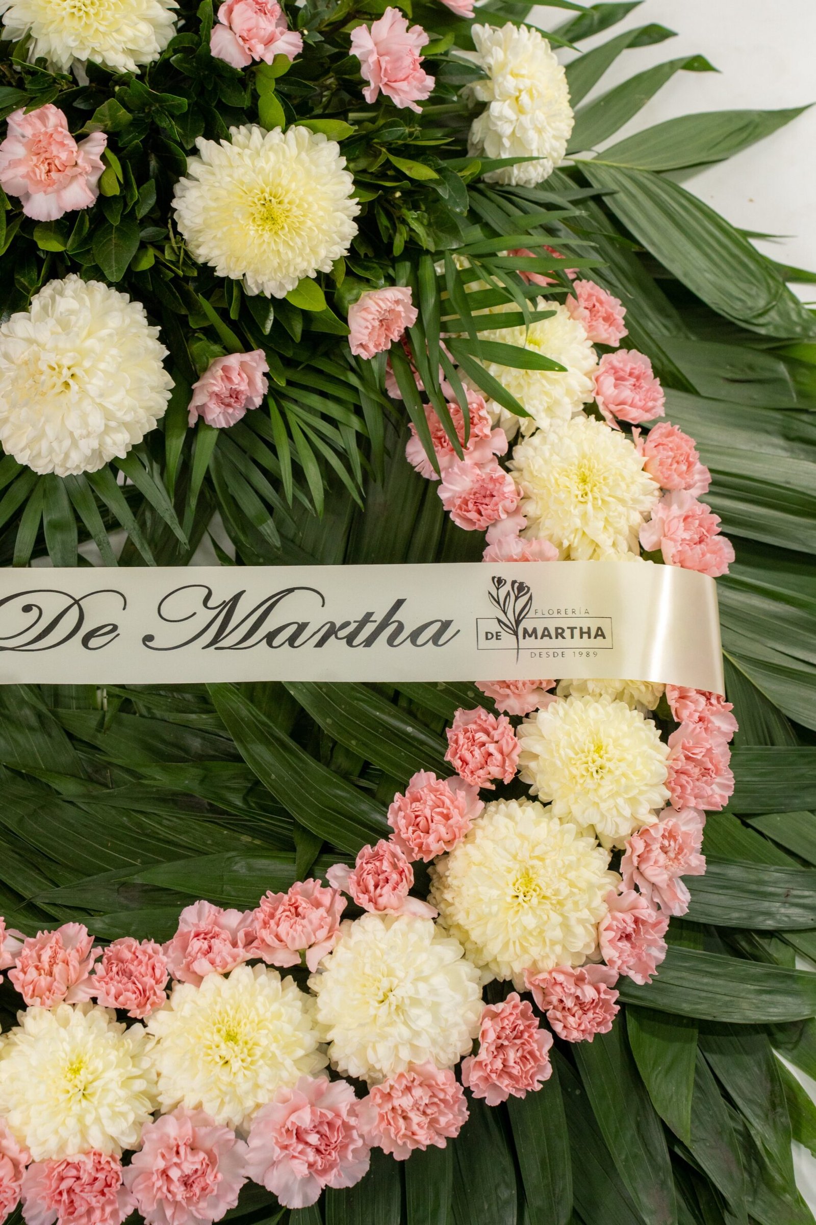 Corona para difunto hecha de Polar blanco y clave rosita, con su respectivo Copete de adorno. Dimensiones: 70 cm de ancho ( aro ), 1 metro de ancho con follaje.