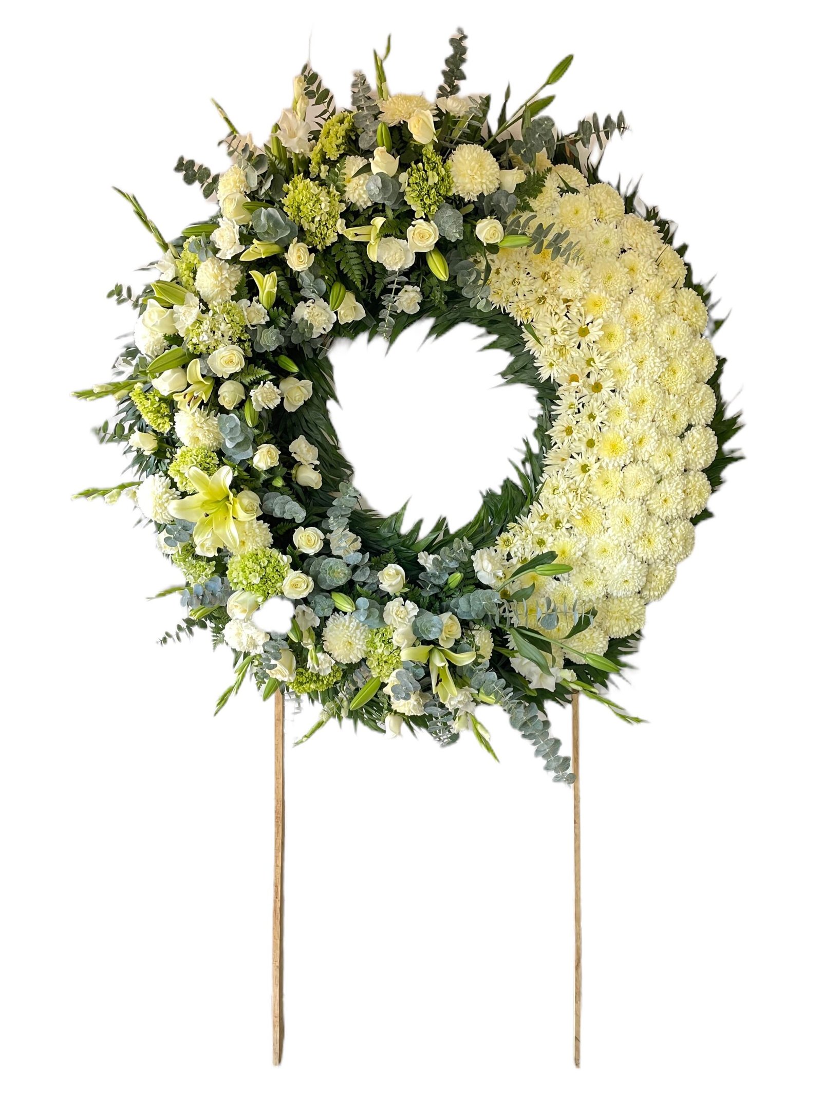 Corona Monumental Premium grande de polar, Lili, Rosa Blanca, Hortensia Verde, clavel blanco, dólar, Dimensiones: 1 metro de ancho ( aro ), 1.40 metros de ancho con follaje, altura aproximada de 2 metros.