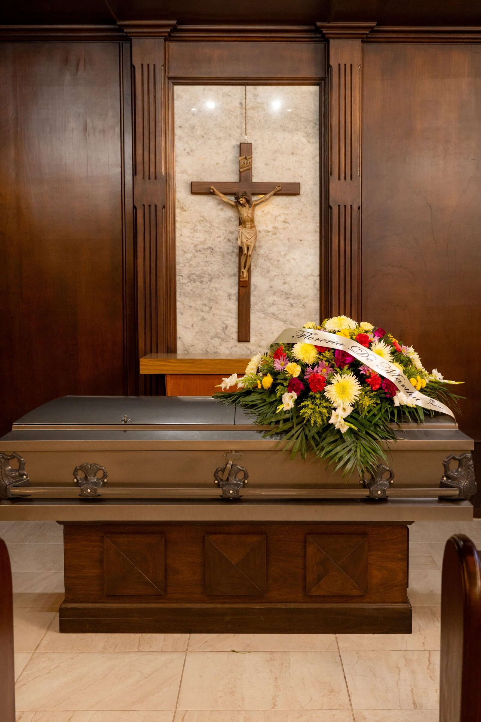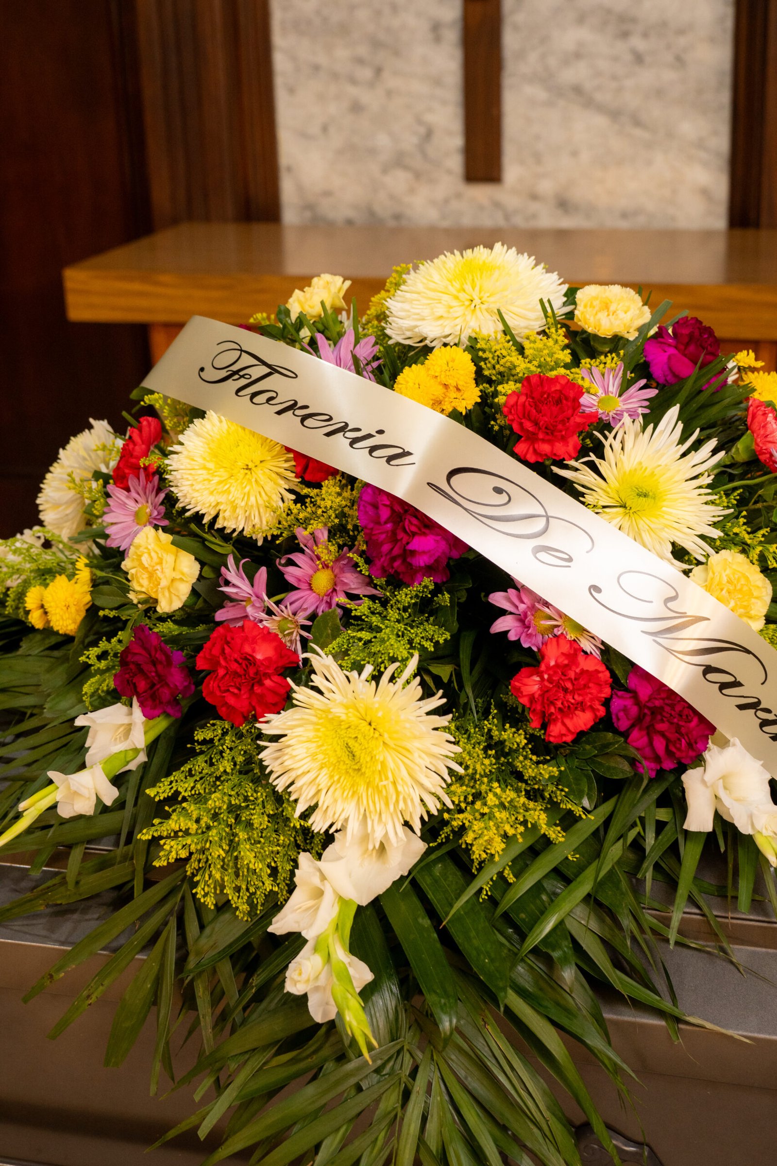 Ofrenda floral para ataúd fúnebre, consta de un surtido de colores con flores mixtas Dimensiones : 80 cms de largo x 45 cms de alto. Base: Plástico Chalupa Rectangular Mediana.