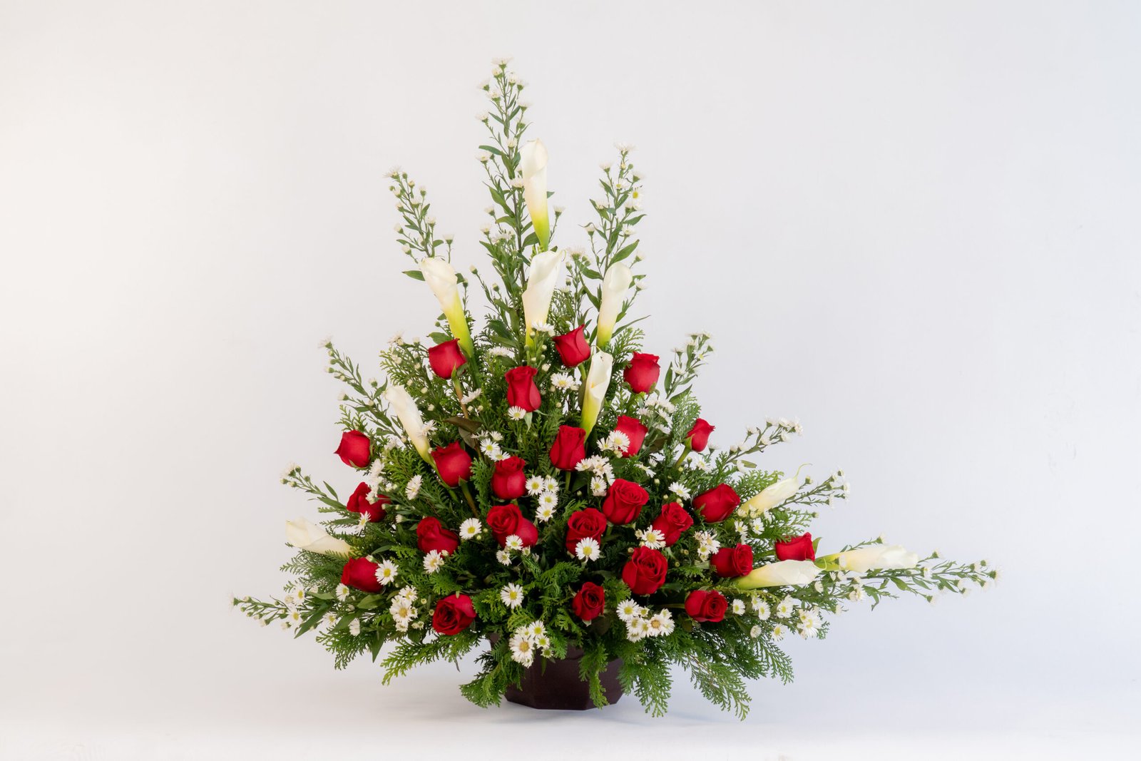 Medidas: 90cm de alto, 55cm de ancho. Flores: 24 Rosas rojas y 10 Alcatraz, Base Huacal Grande.