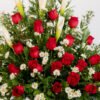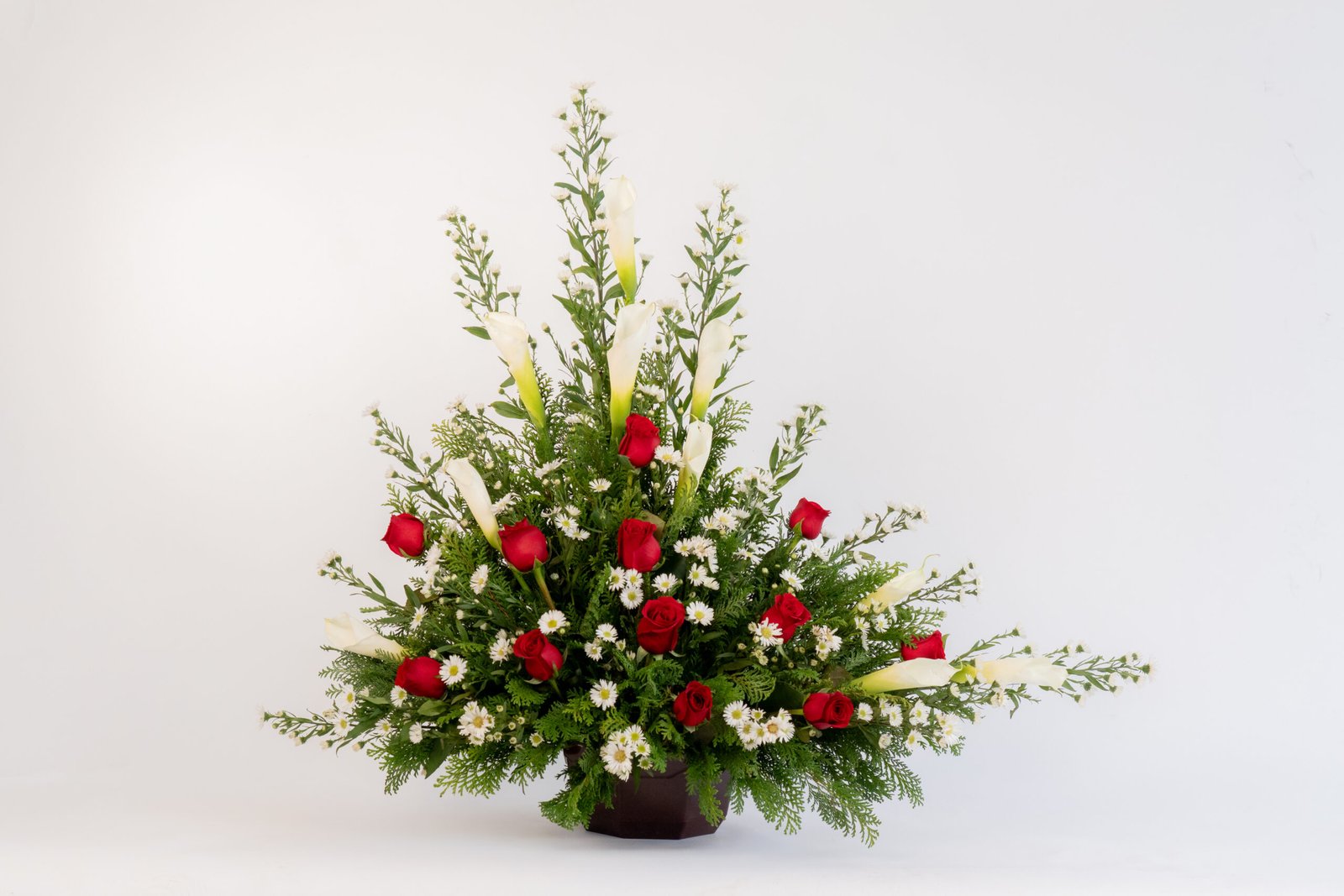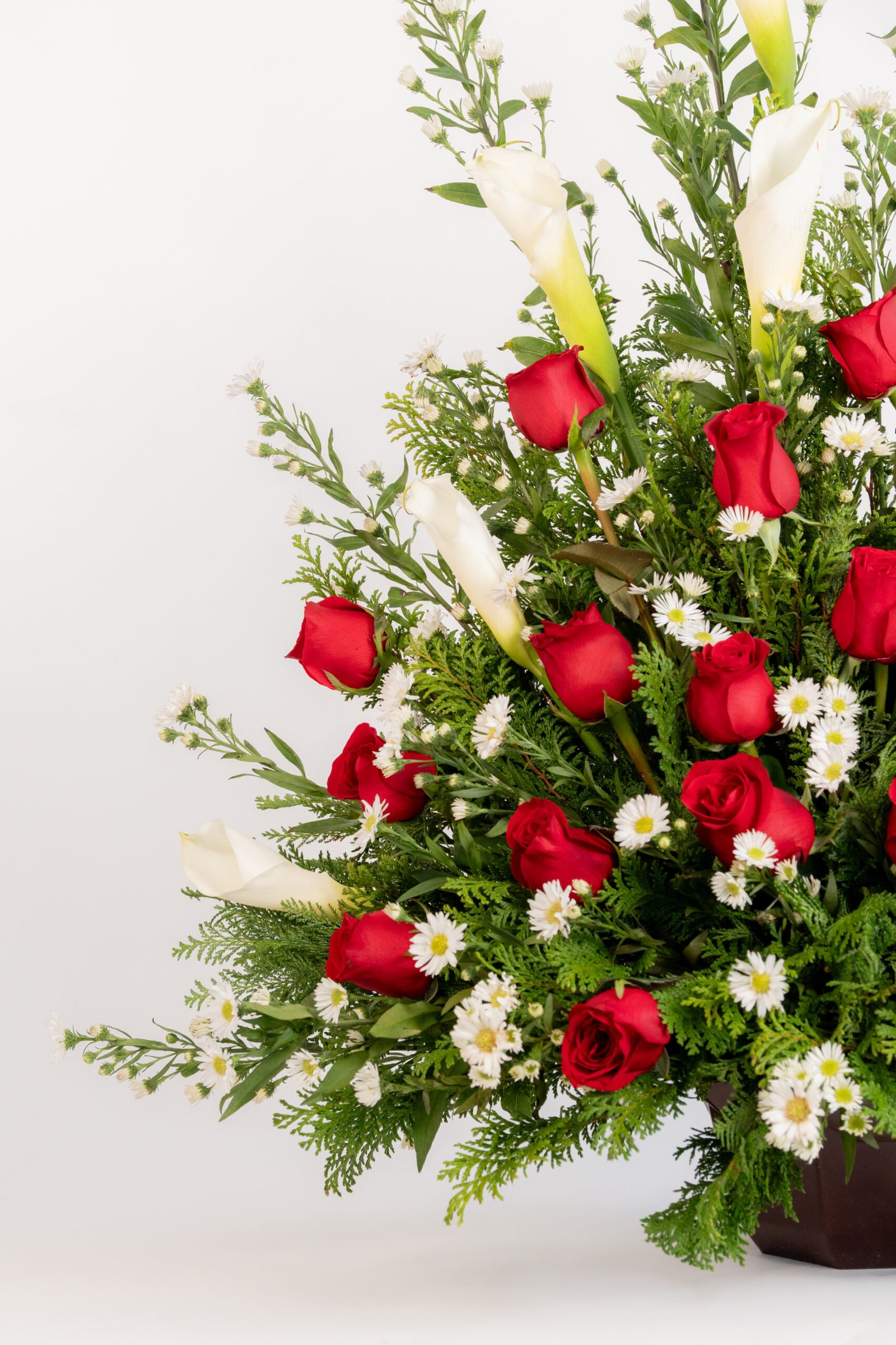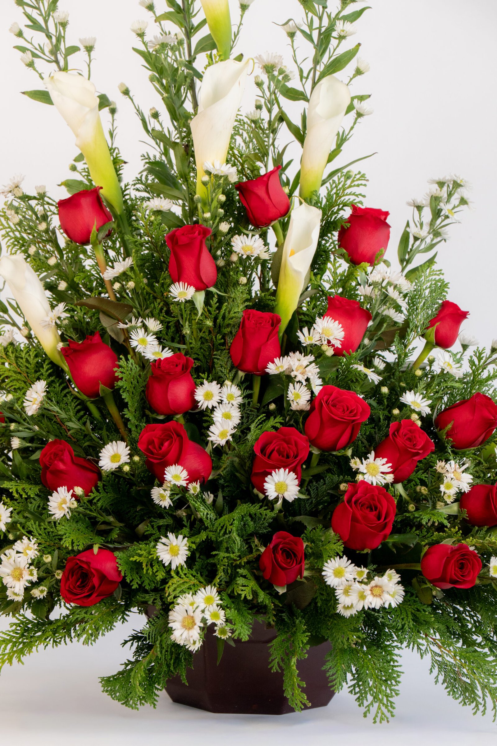 Medidas: 90cm alto, 90cm ancho, Flores: 12 rosas rojas y 10 alcatraz, Base: Huacal Grande,