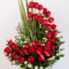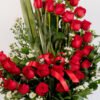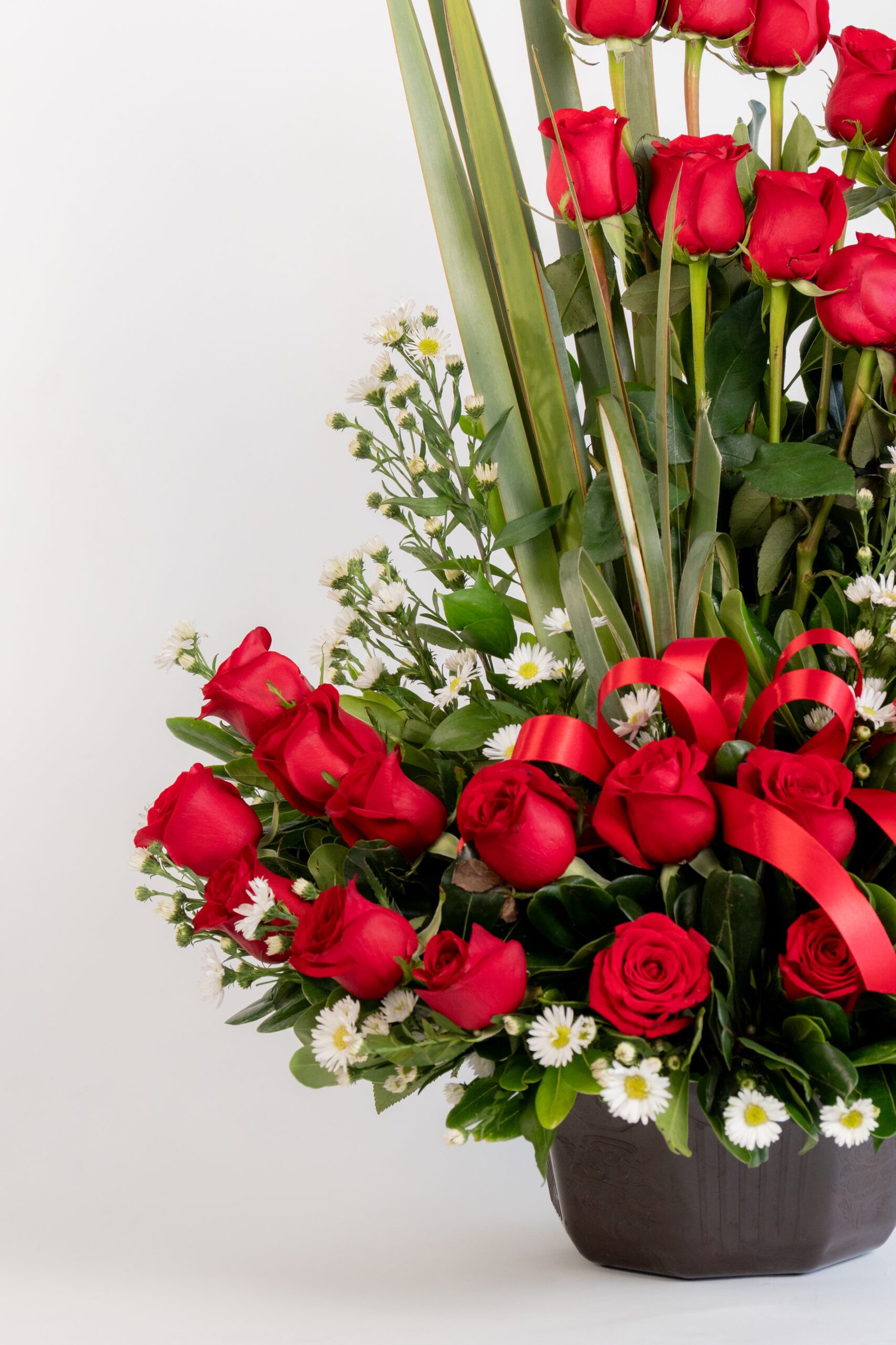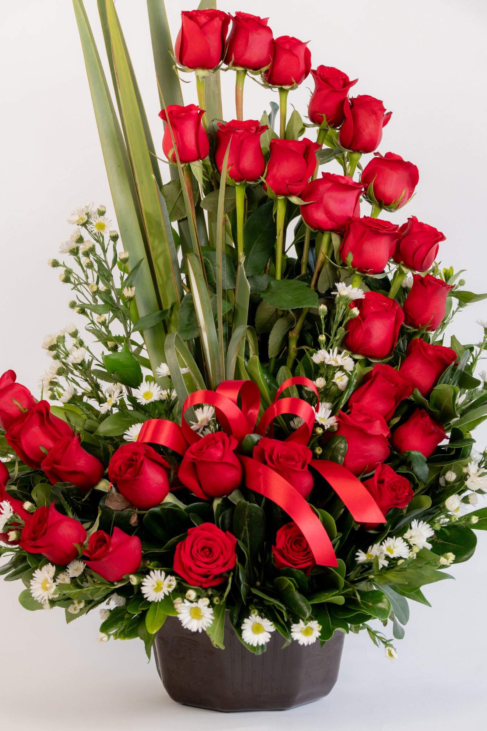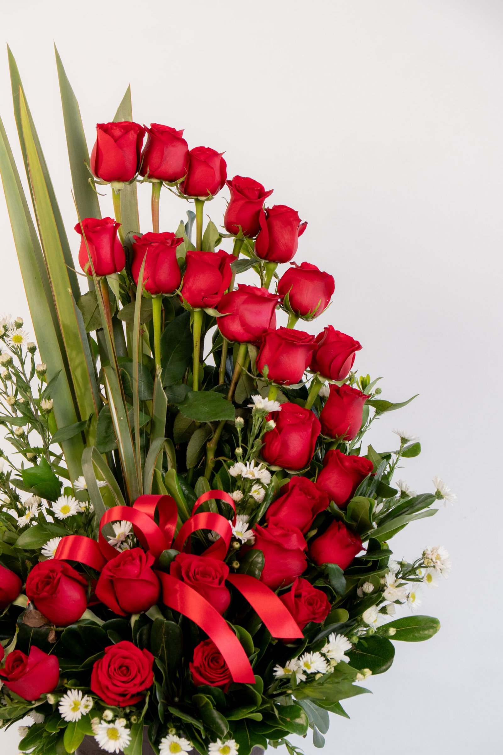 Arreglo 30 Rosas Rojas en Espiral - Estilo! Estilo!... Amor! Follage: Leather Relleno: Aster Medias: 90 cm de alto, 75 cm de ancho. Base: Huacal Grande