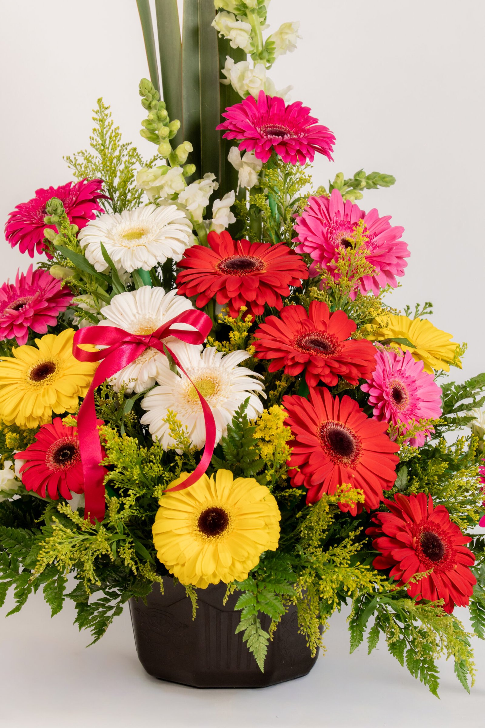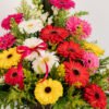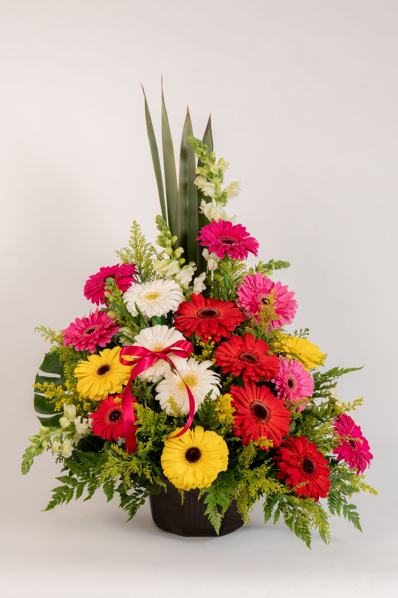 Medidas: 70cm alto , 75cm ancho, Flores: 18 gerberas colores surtidos , Base: Canasta o huacal mediano