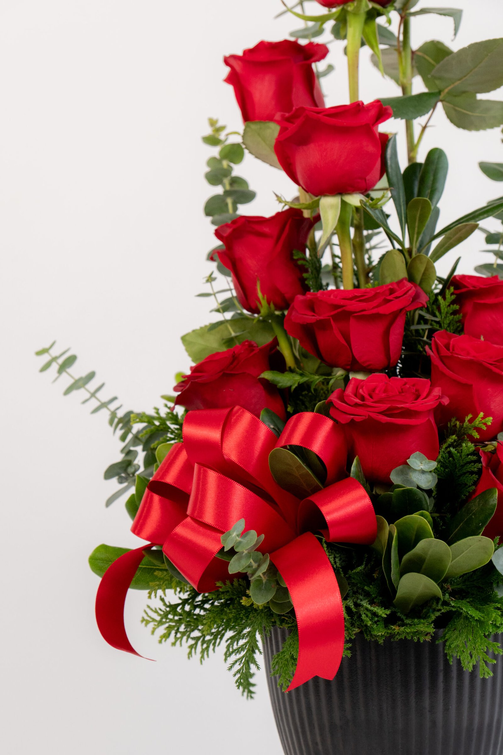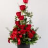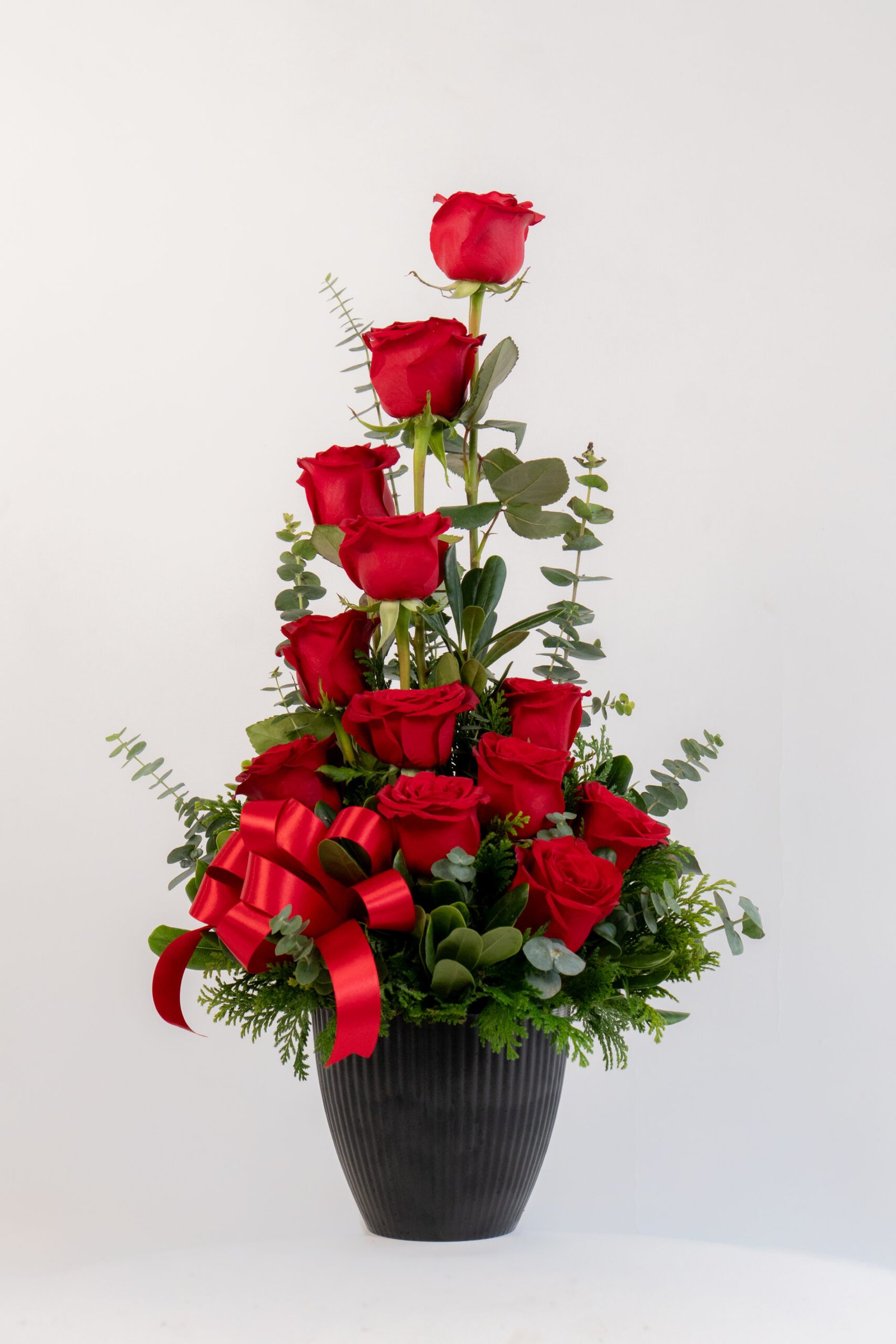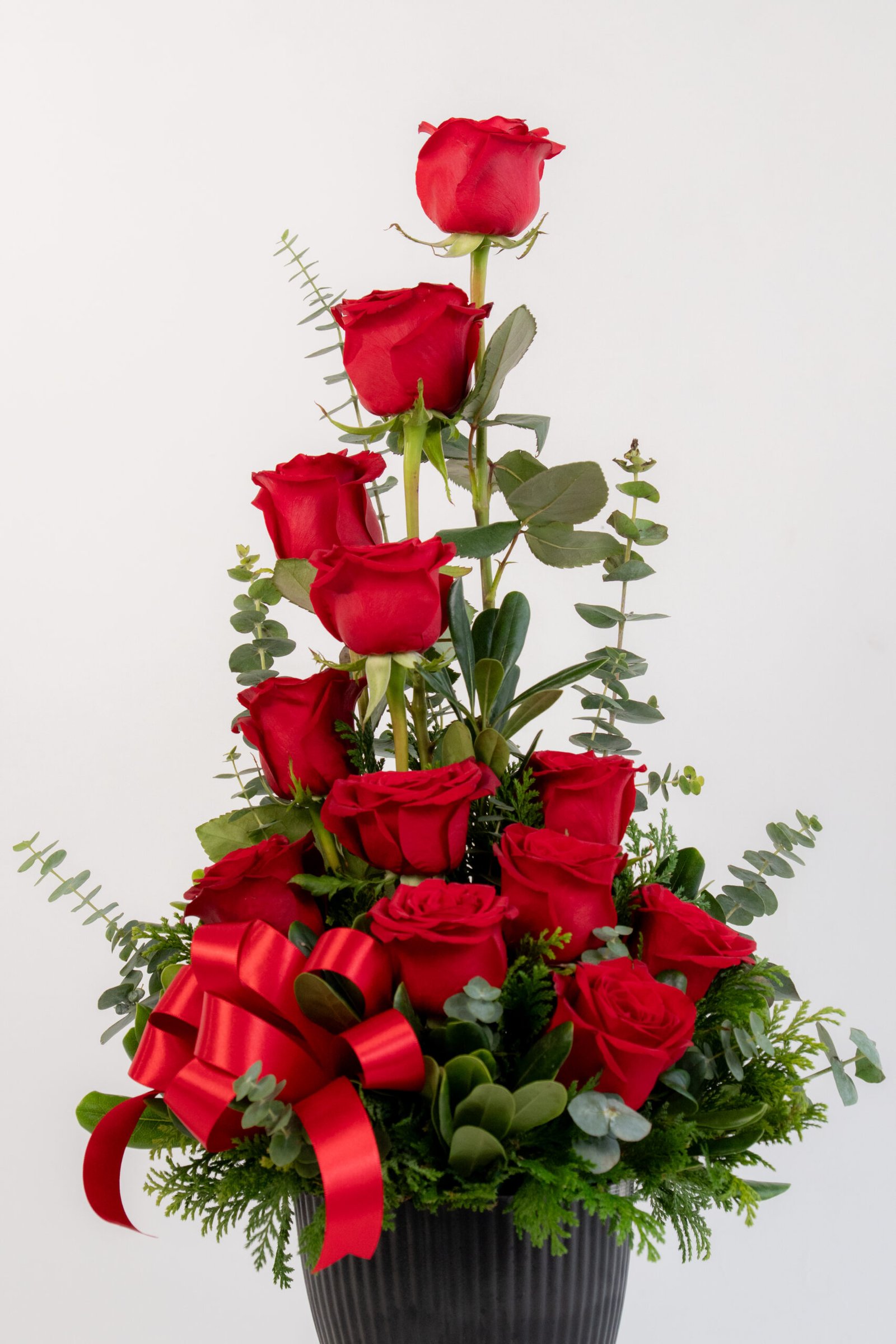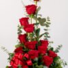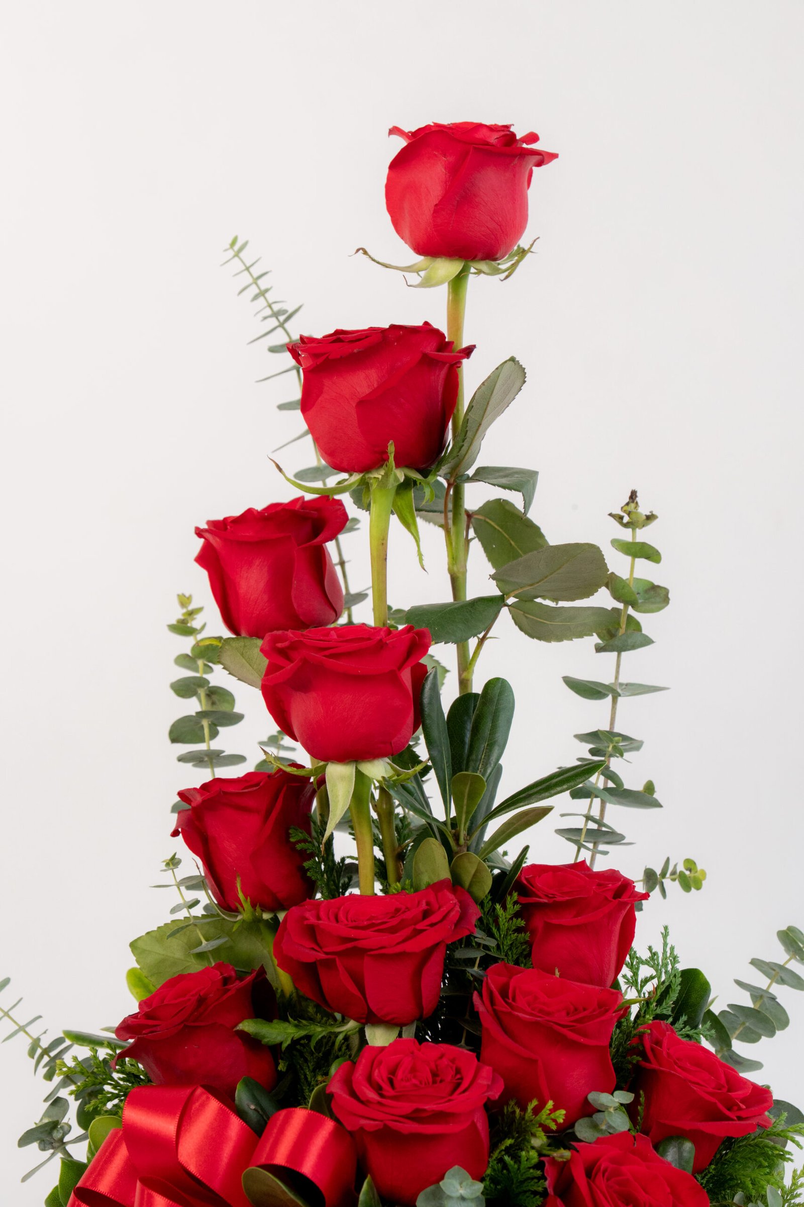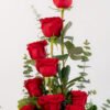 Medidas: 50cm alto x 30cm ancho, Flores: 12 rosas rojas, Base: Plastico