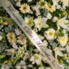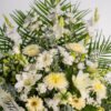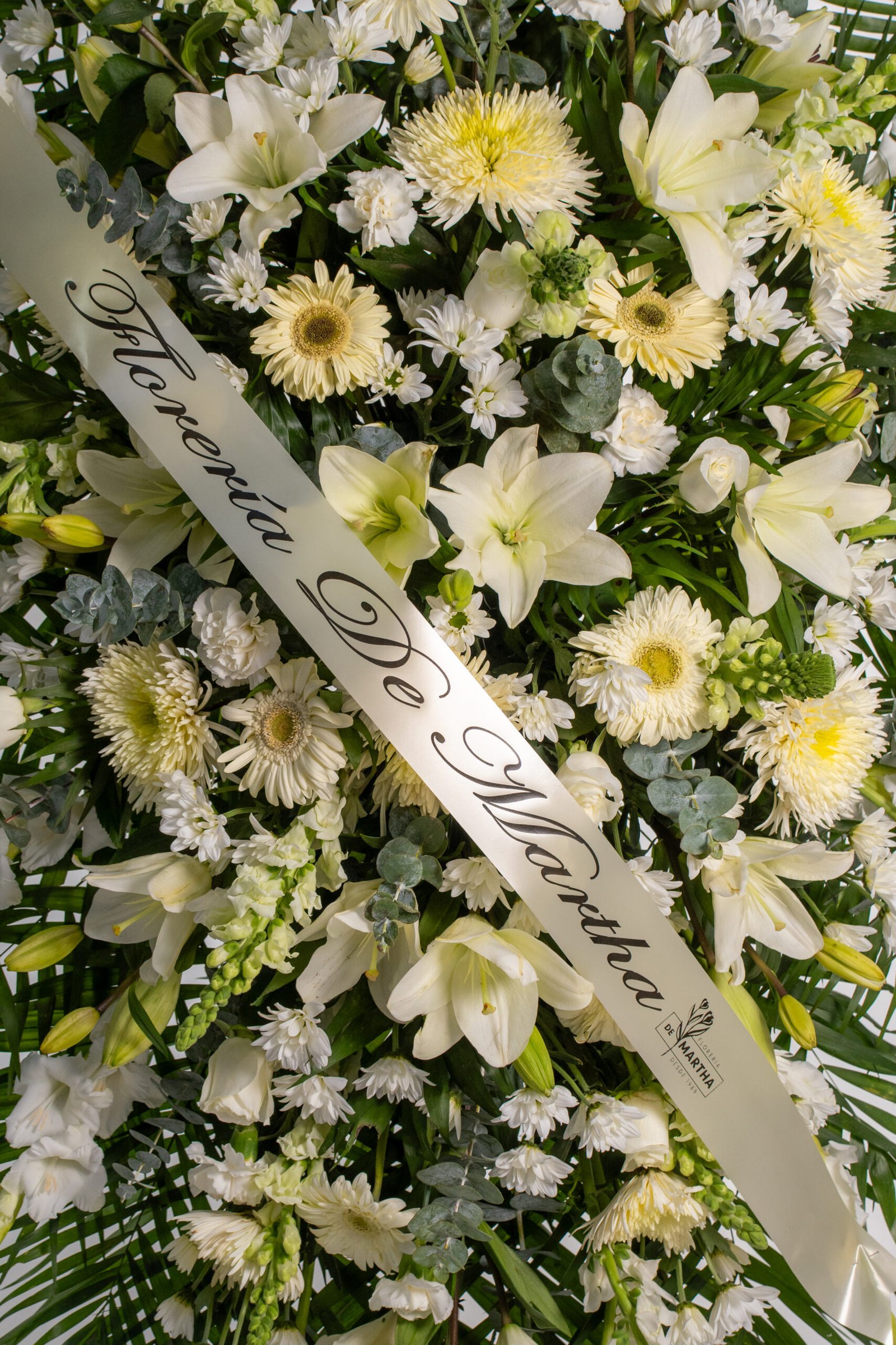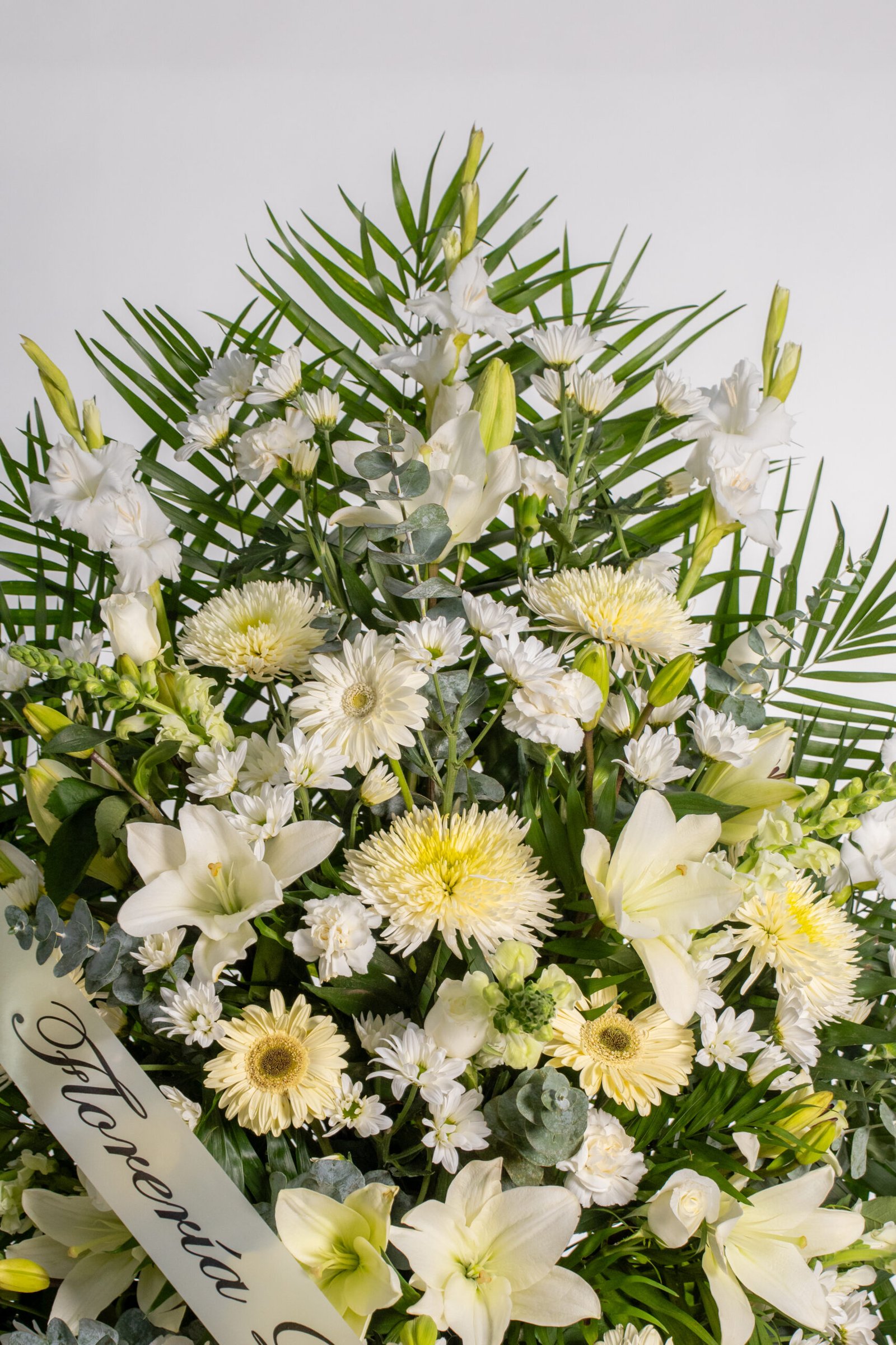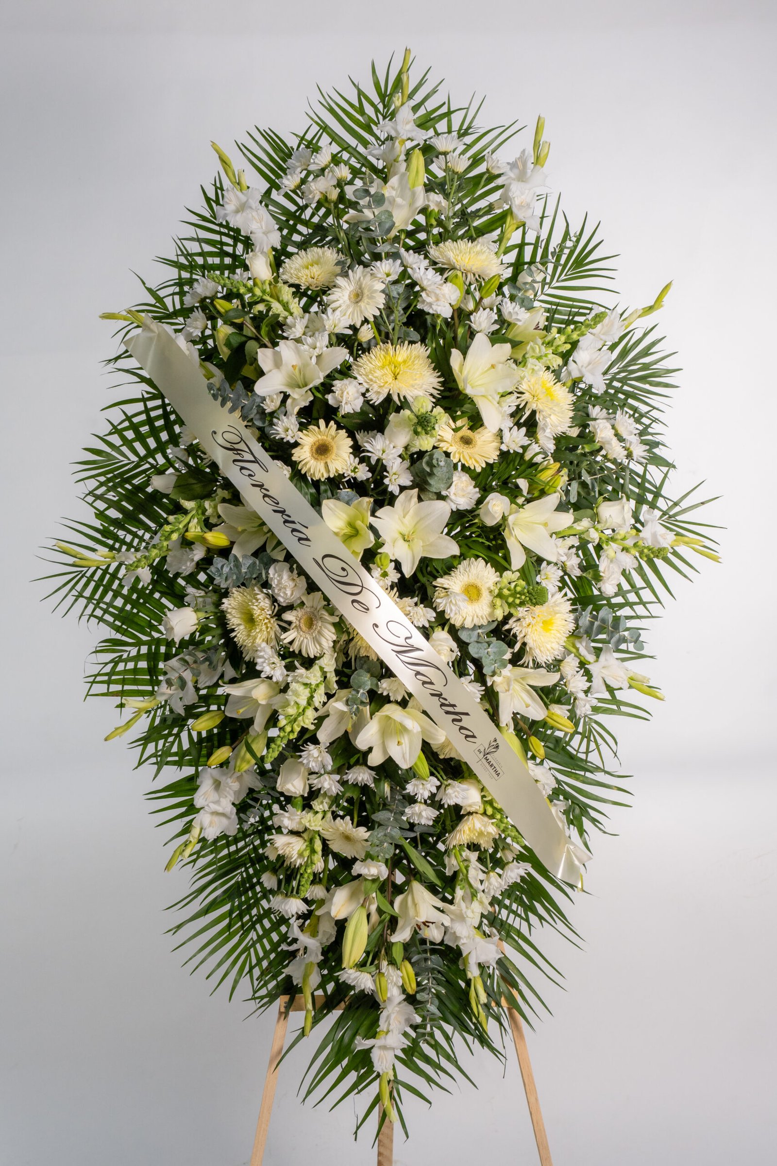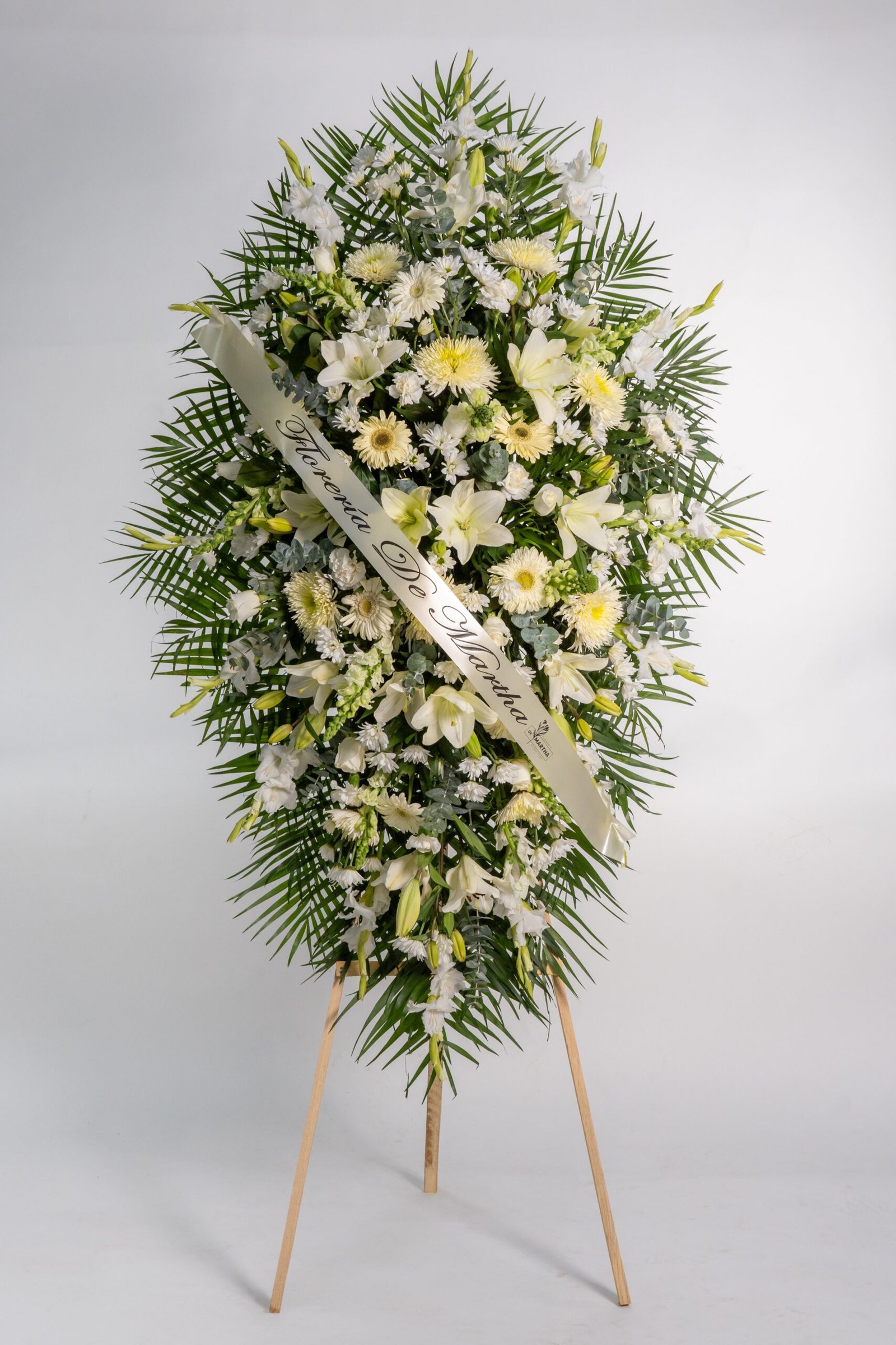 Medallón* de Lilis, Rosas, gerberas, perritos, Margarita, clavel y spider blancos *Incluye Tripie de apoyo para Medallón.