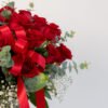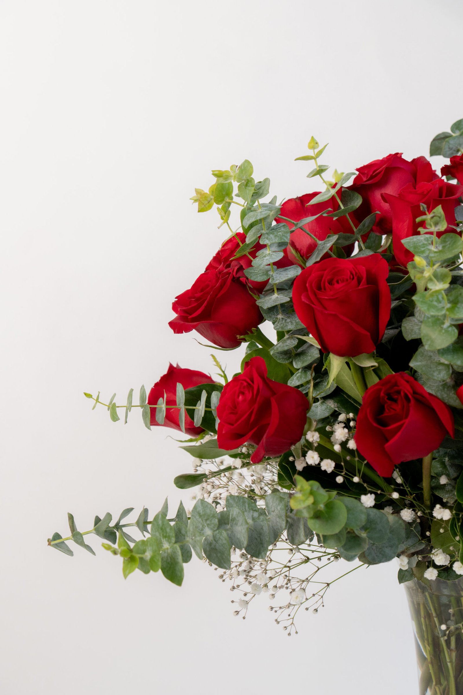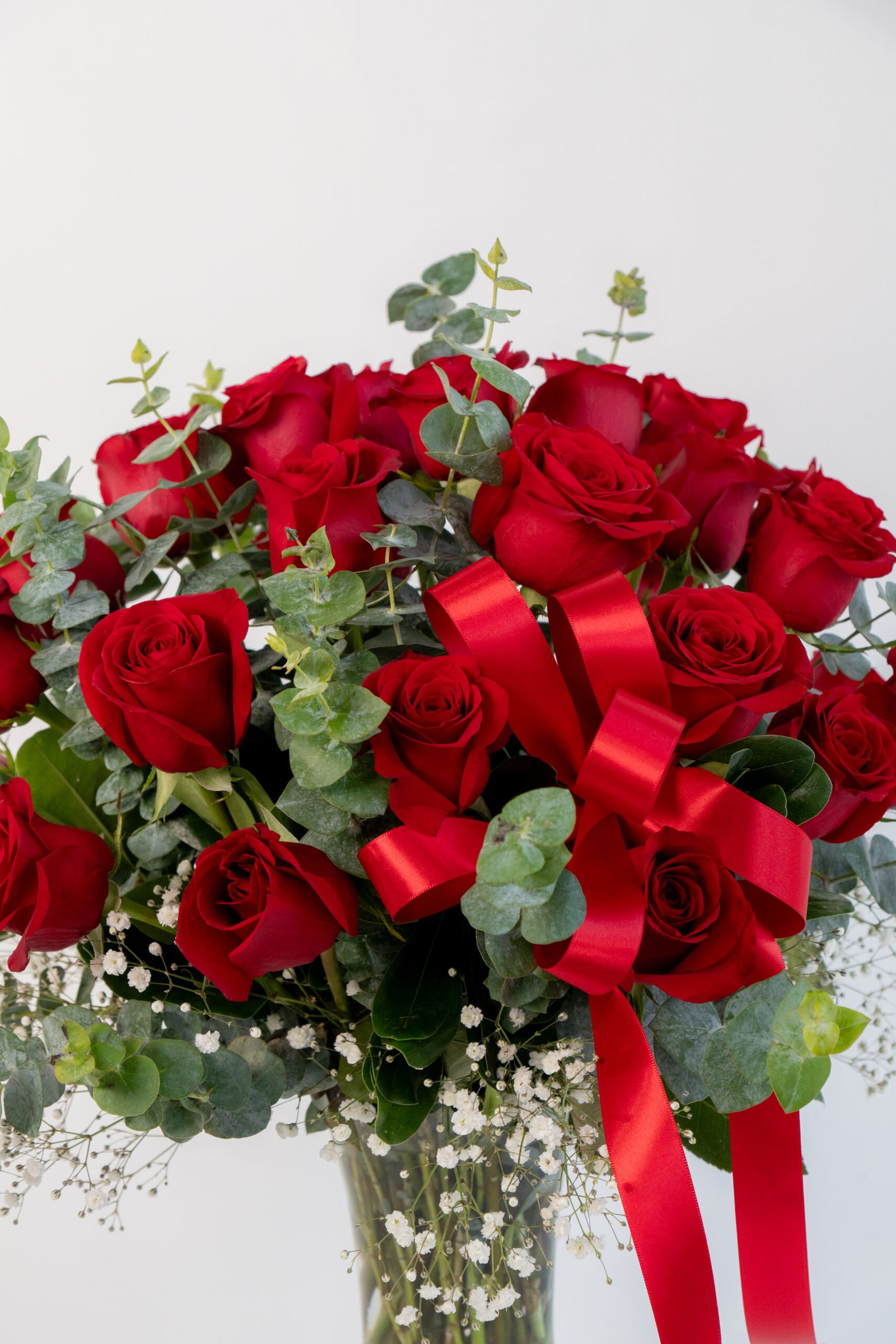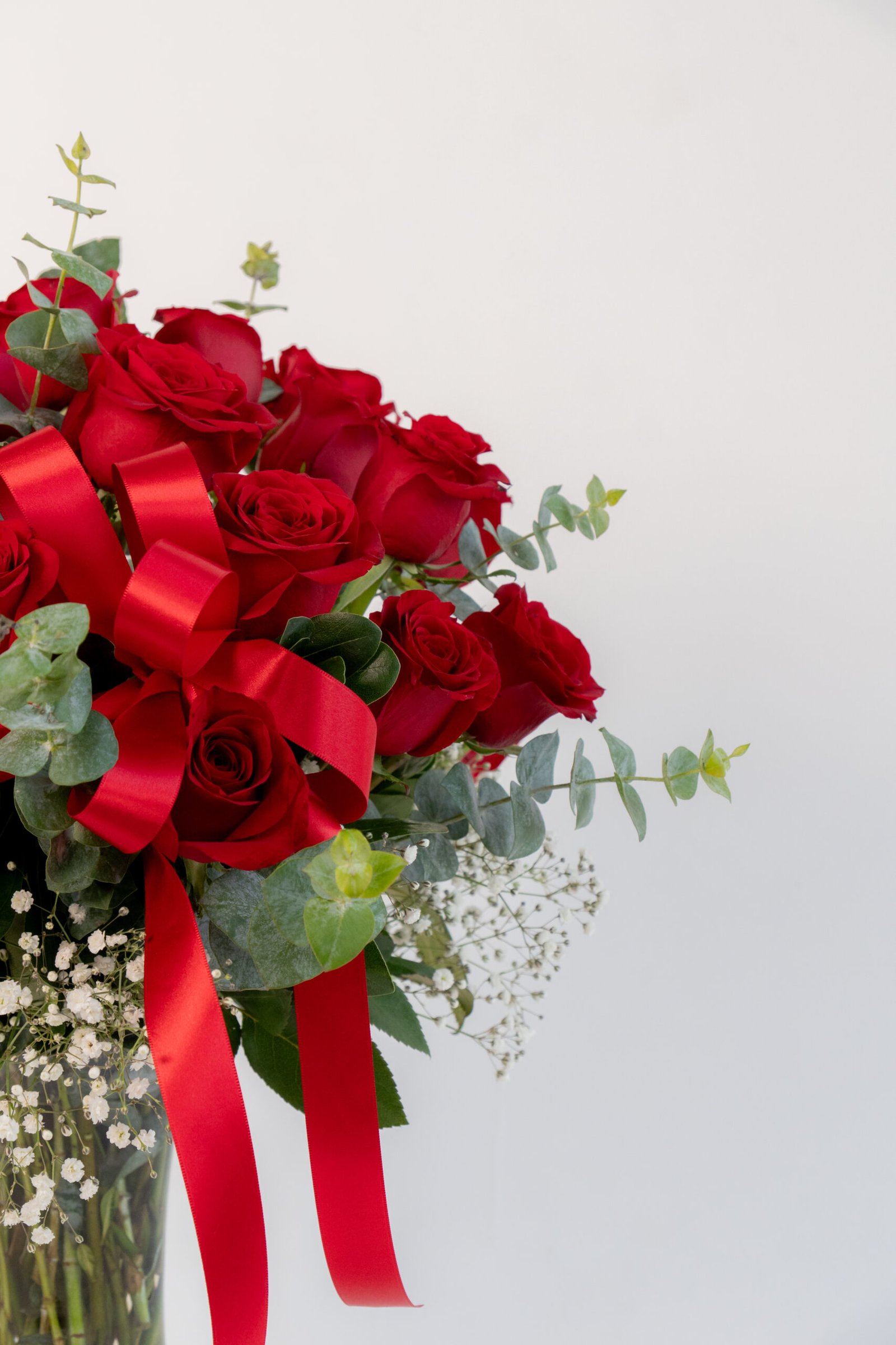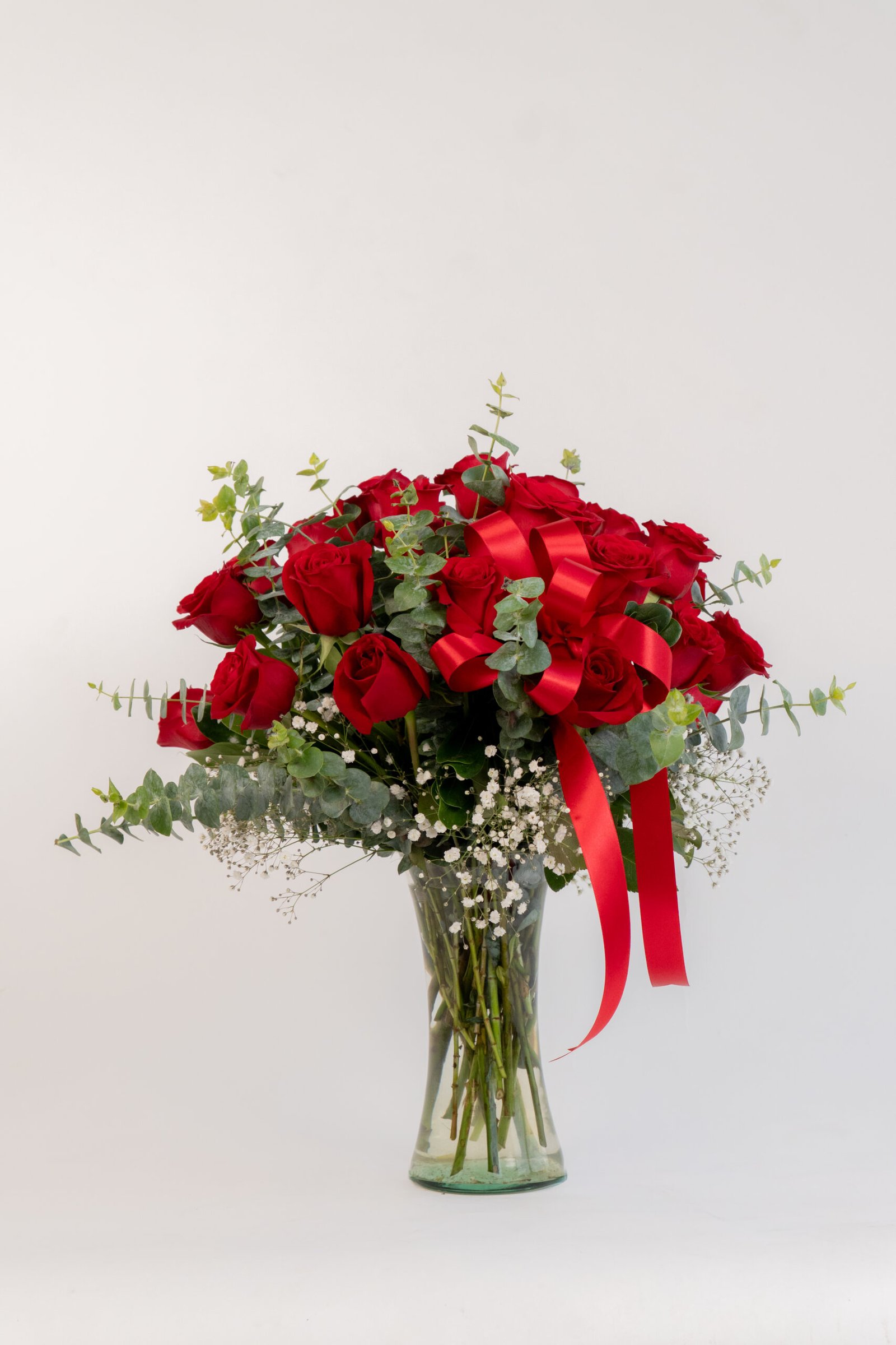 Medidas: 45cm alto x 30 cm ancho. Flores: 24 rosas rojas. Base: Jarrón de Vidrio