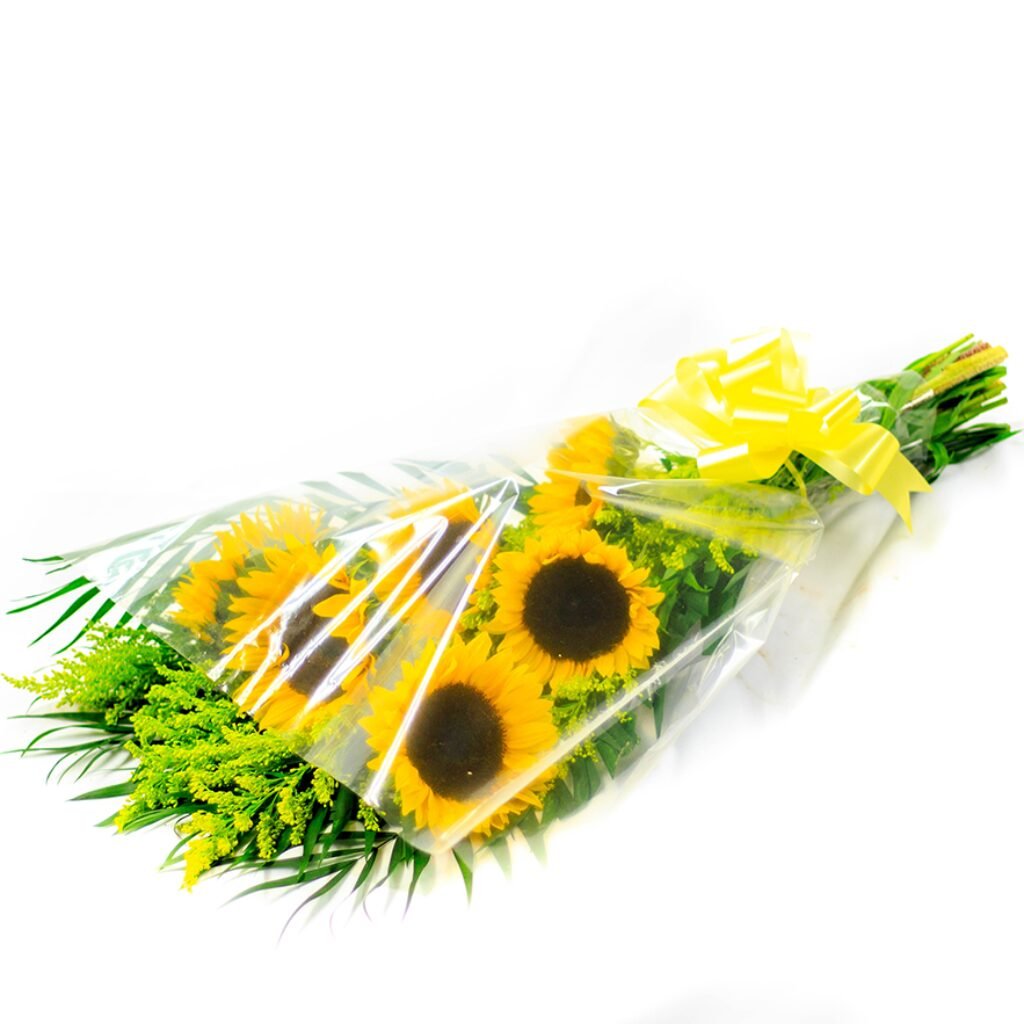 -Envuelto en Papel Mica transparente. - Follajes: Cambray. - Relleno: Solidago -Moño decorativo. Dimensiones: 65 cm de altura, 40 cm de ancho.