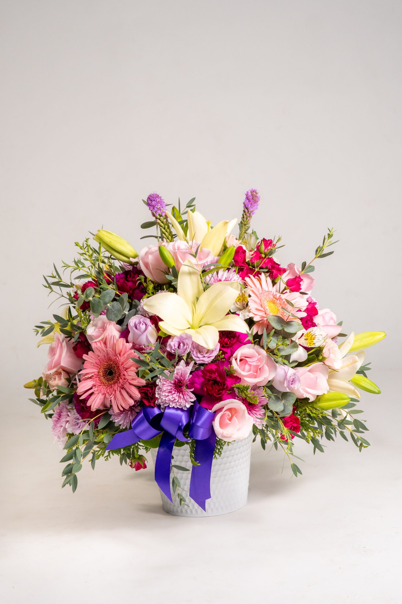 Medidas: 40cm alto x 45cm ancho, Flores: Gerberas, rosas, leatix, claveles, moreliana, lilis y mini rosa, Base: Latón