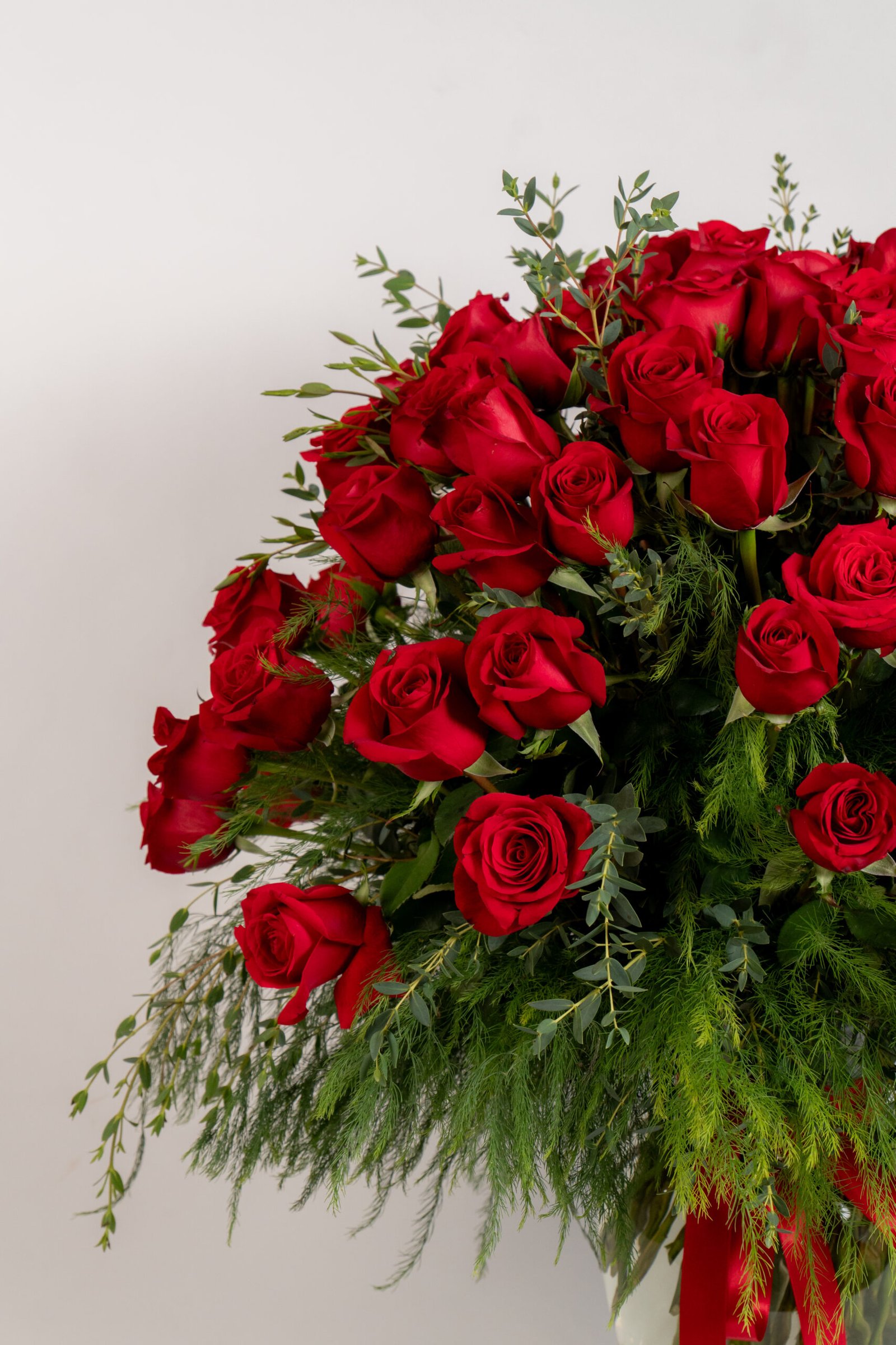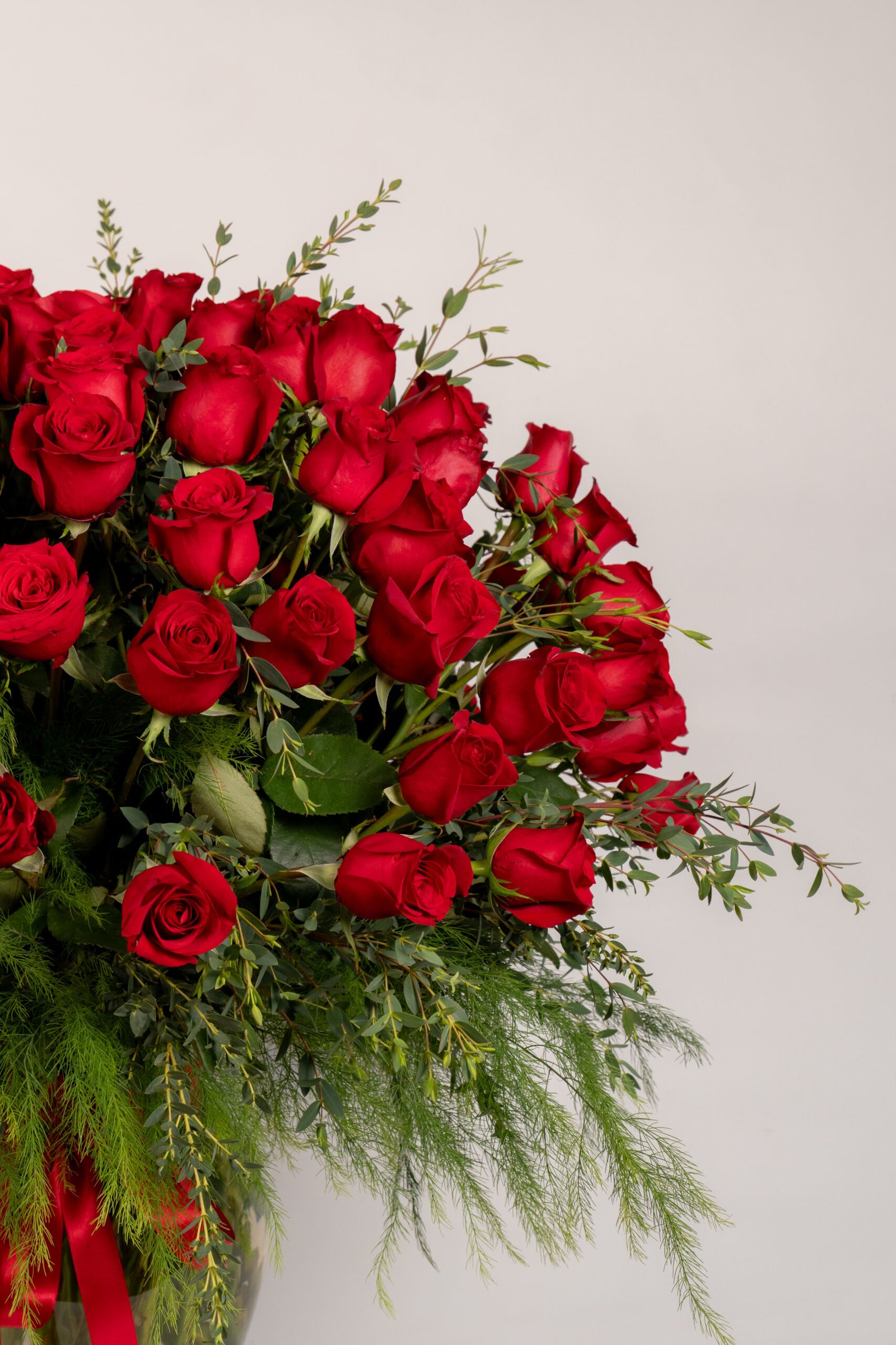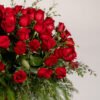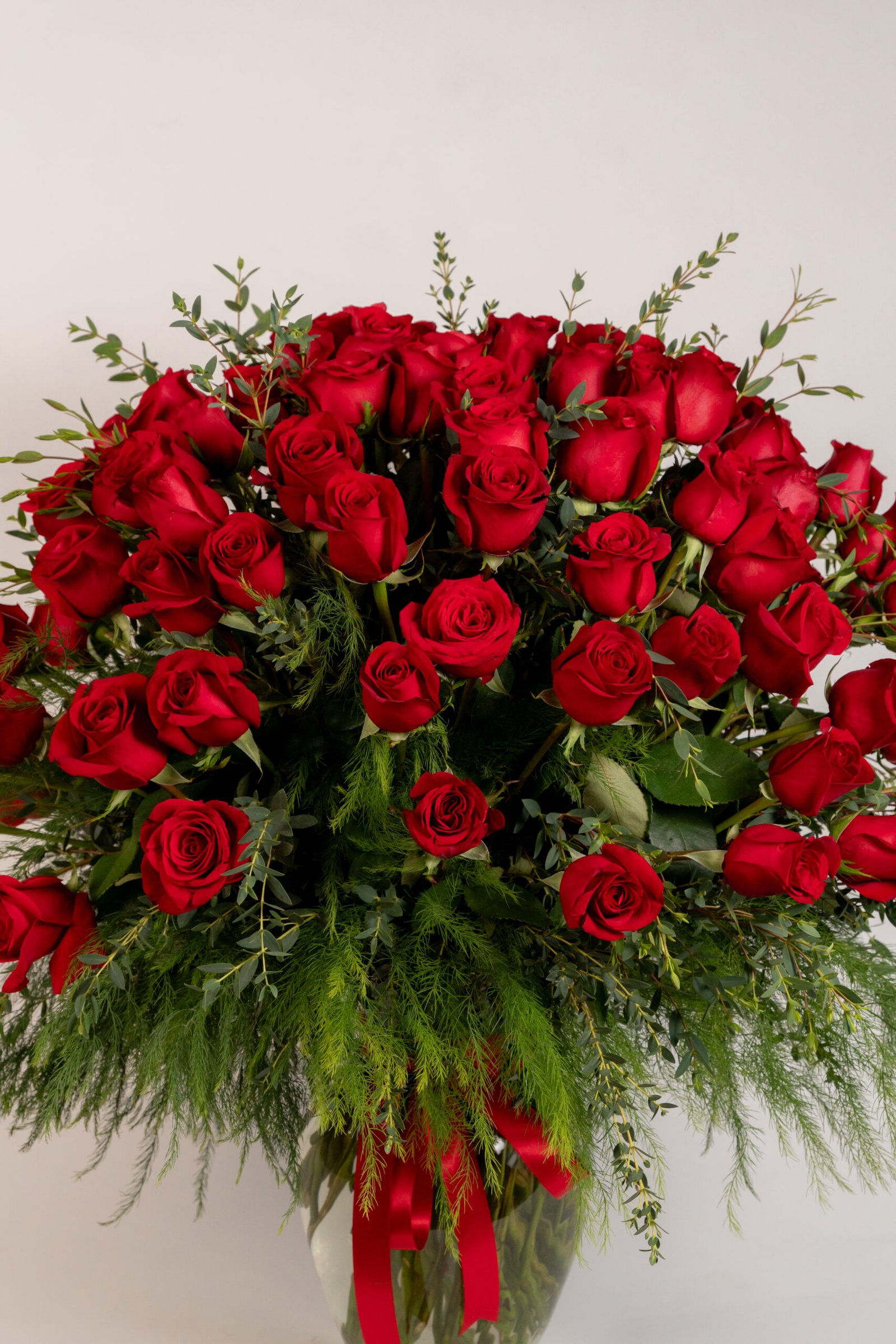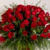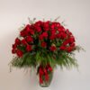 Medidas: 65cm alto x 60cm ancho, Flores: 100 rosas rojas, Base: Jarrón de Vidrio