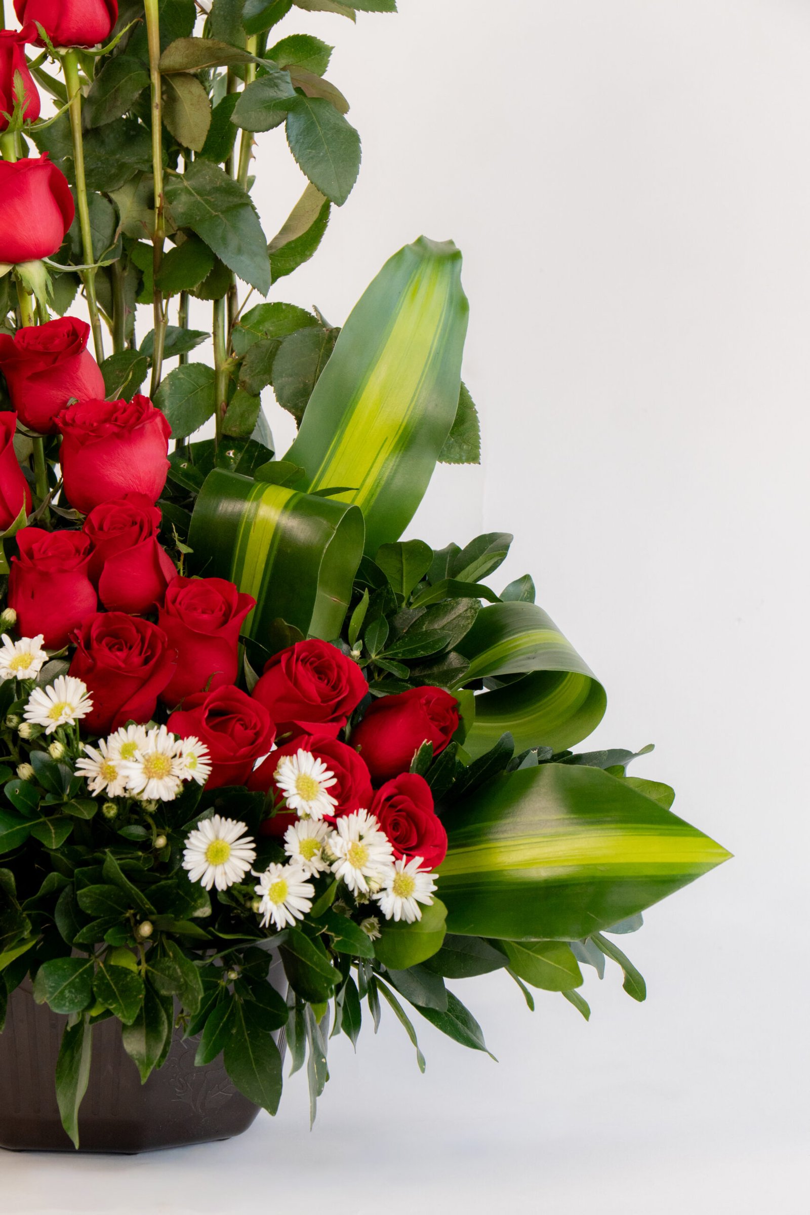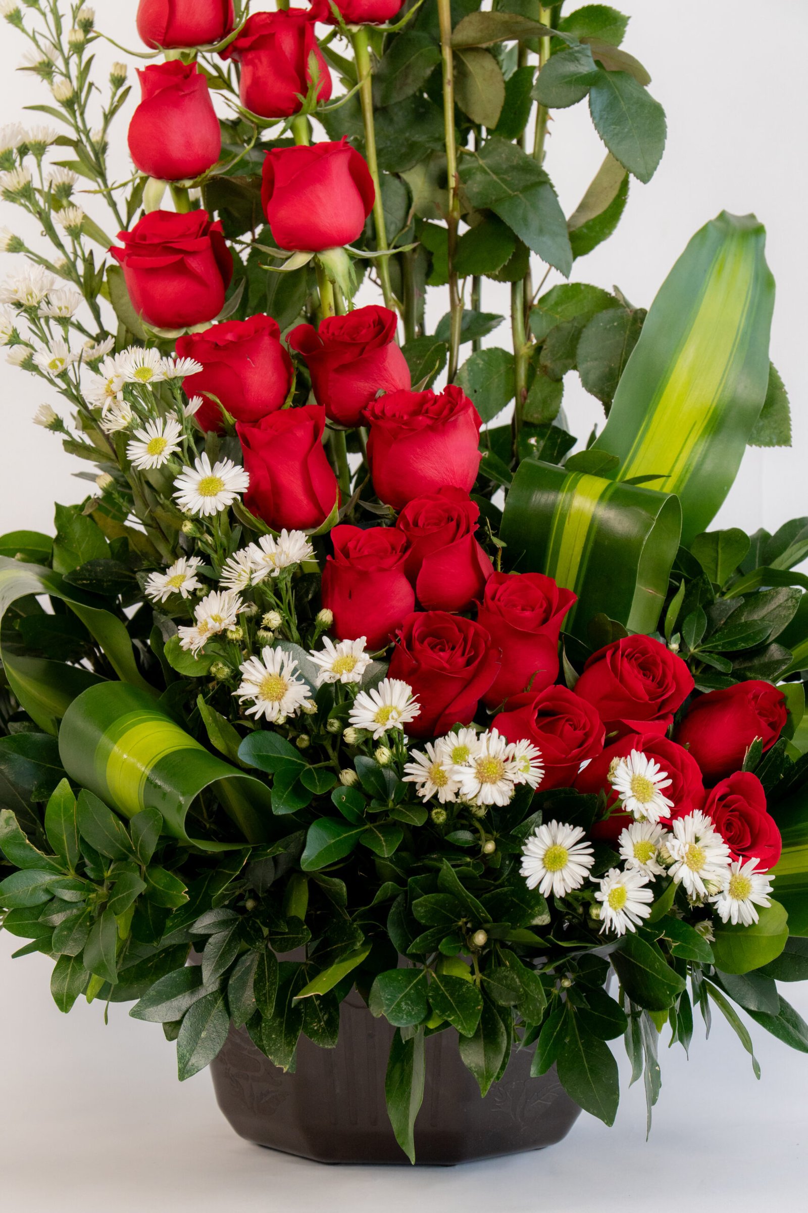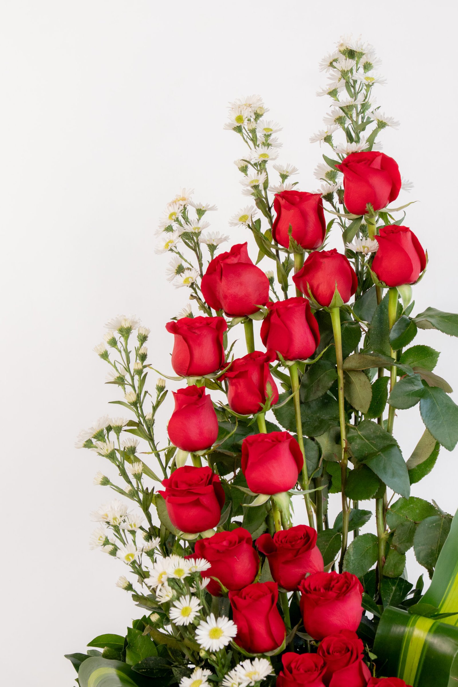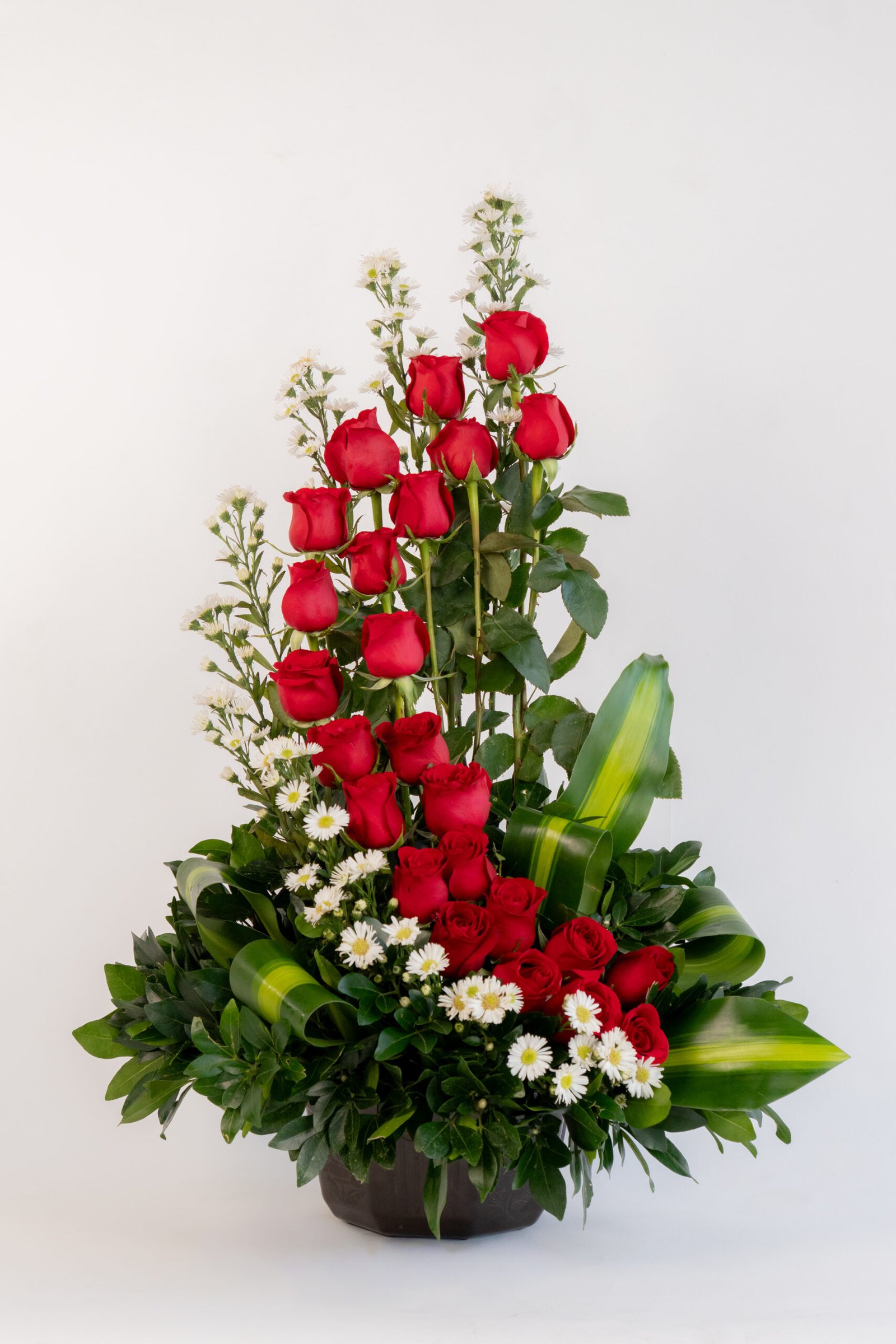 Arreglo 24 Rosas Rojas en Espiral ( maicera ) Follage: Clavo, Maicera. Relleno: Aster Medidas: 90 cm de alto x 70 cm de ancho. Base: Huacal Grande.