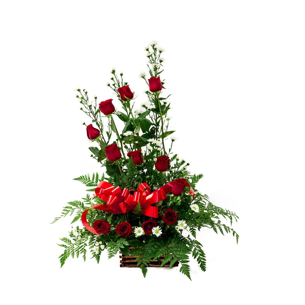 Detalle minimalista: - 12 Rosas silueta "S" - Base Cónica Café - Follajes finos: Leather. - Relleno de Aster -Moño decorativo. Dimensiones: 80 cm de altura, 60 cm de ancho.
