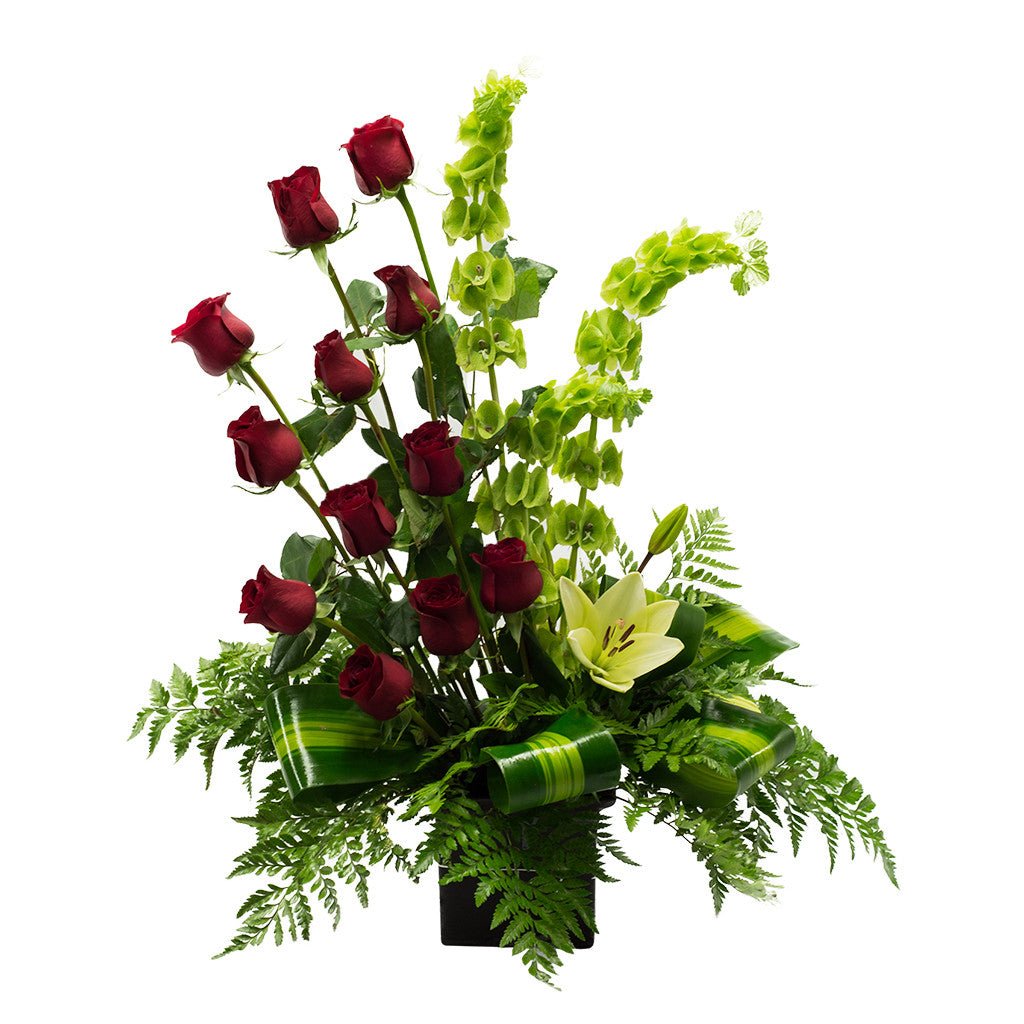 Detalle minimalista: -12 Rosas Rojas - 1 Lili Blanca - Base Cuadrada Color Chocolate. - Follajes finos: Leather ,Ruscus, Maicera y Campana Irlandesa. Dimensiones: 75 cm de altura, 70 cm de ancho.