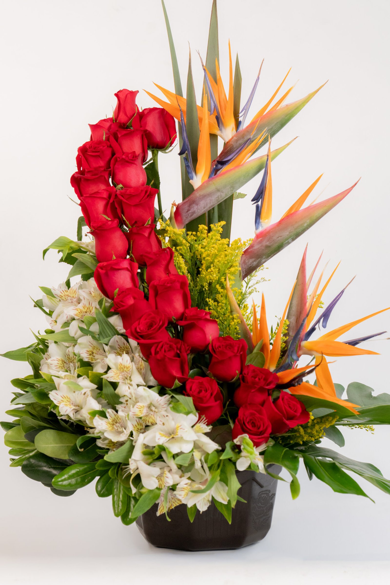Arreglo 24 rosas Rojas - 5 Ave del paraiso - Arreglo que da impresión! Follage: Leather Relleno: Aster y Astromelia Medidas: 90 cm. de alto 70 cm de ancho. Base: Huacal Mediano. Medidas: 90 cm alto, 70cm ancho