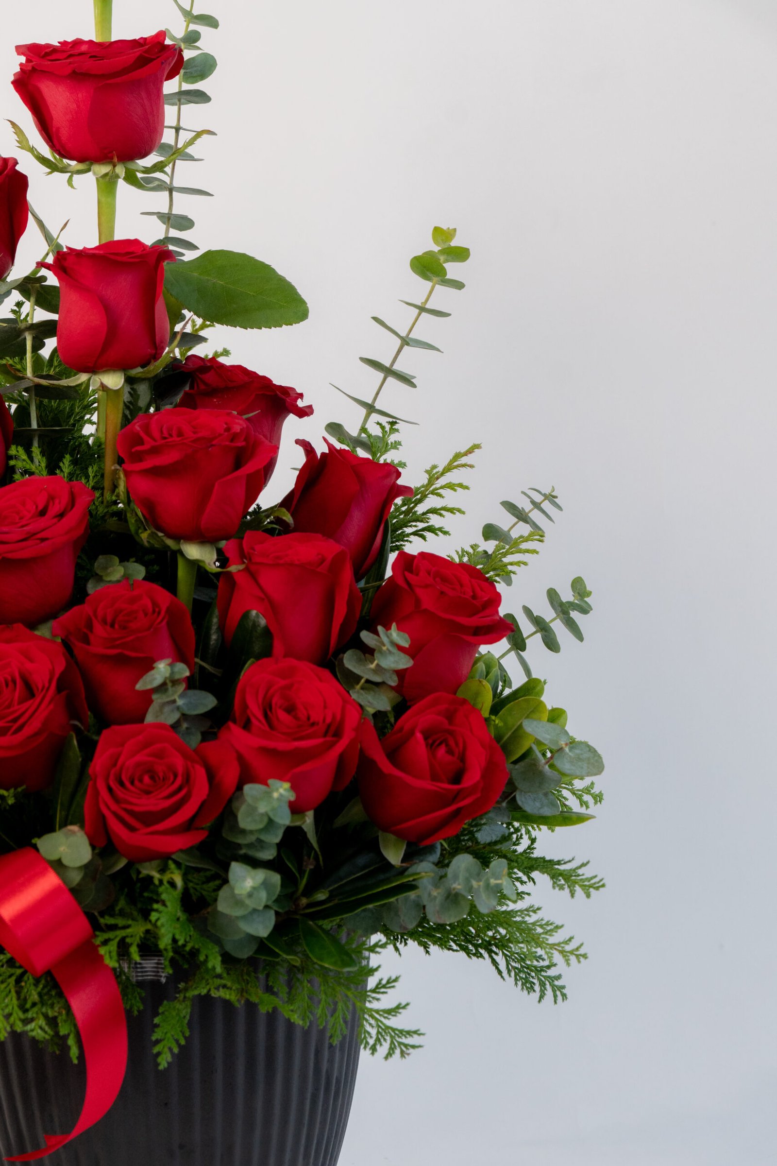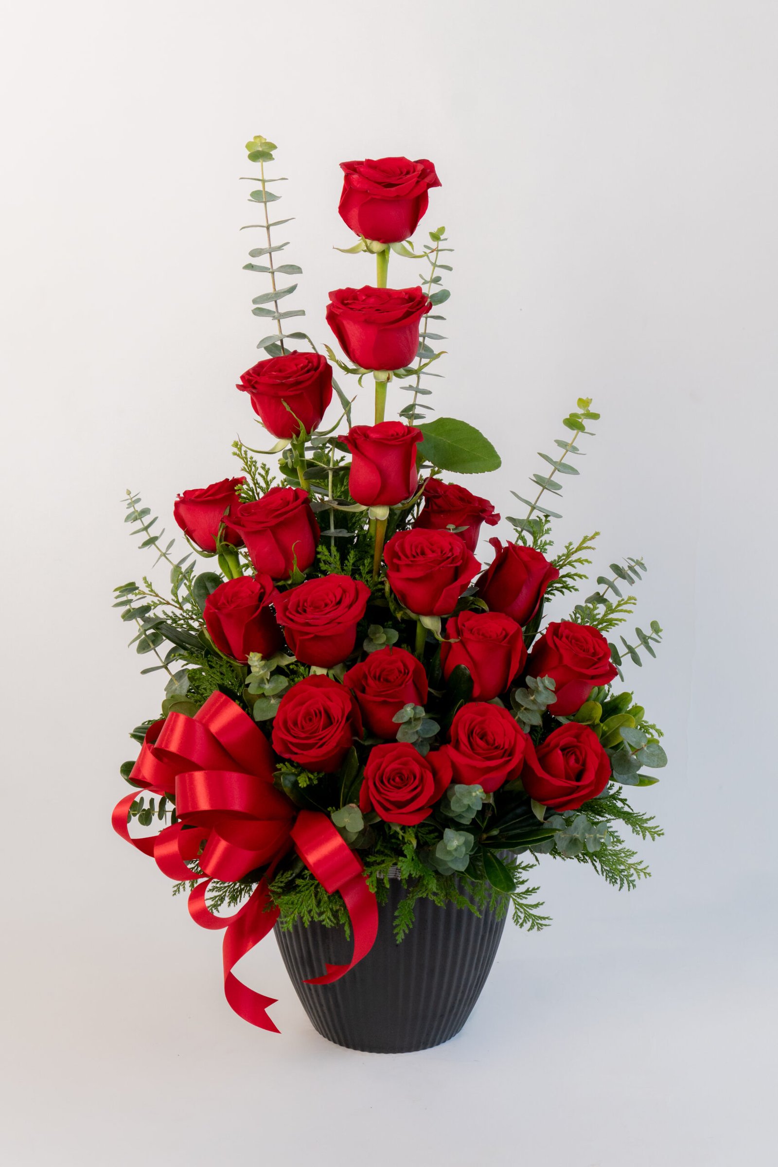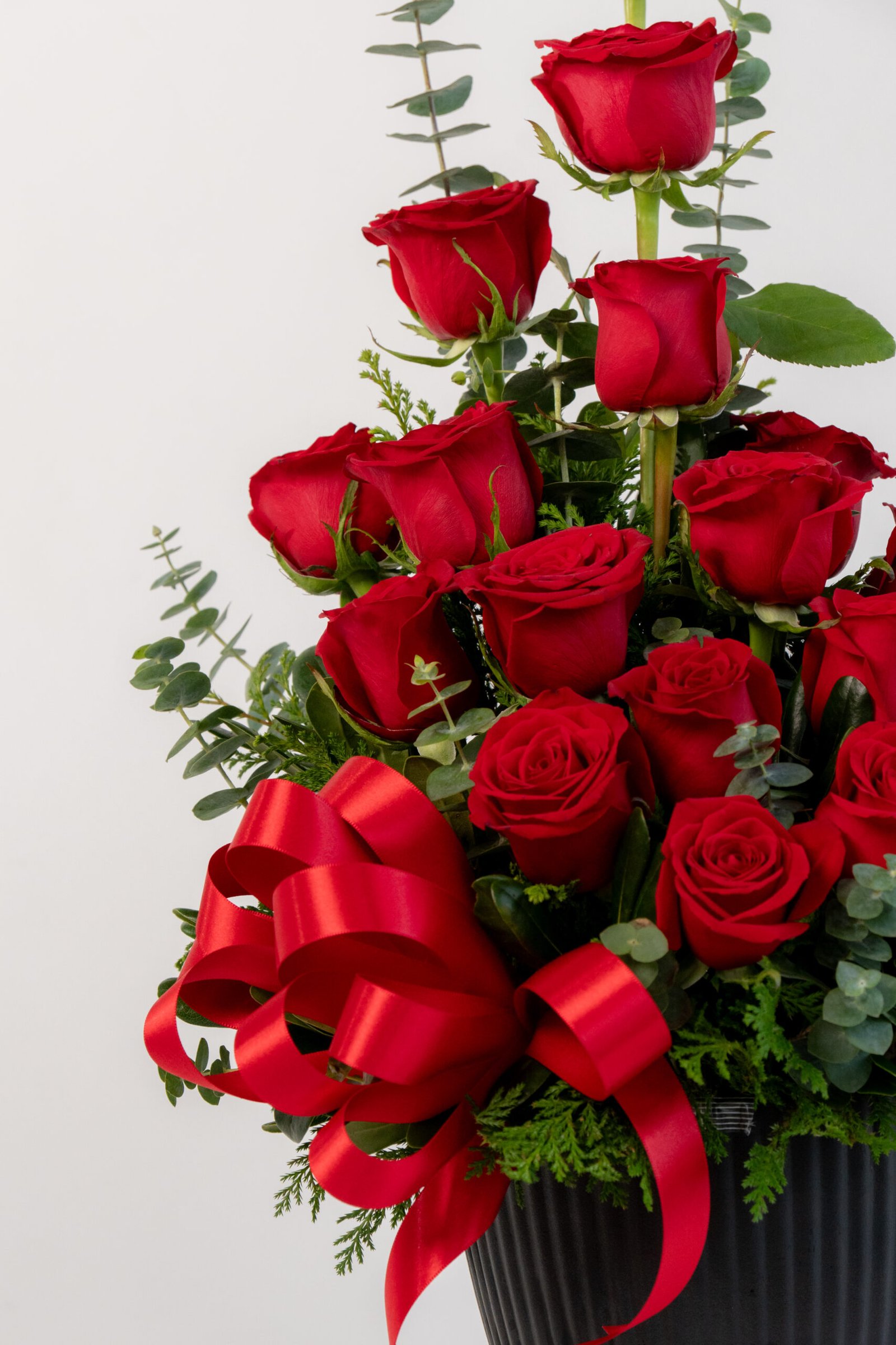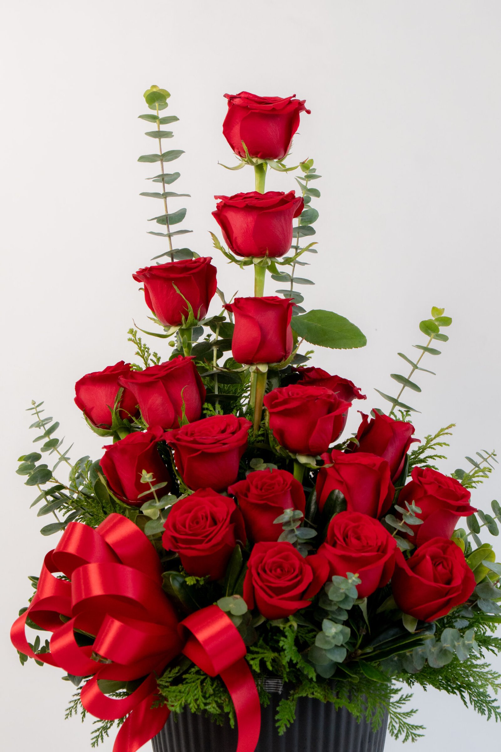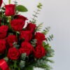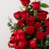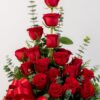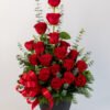 Medidas: 60cm alto x 40cm ancho, Flores: 18 rosas rojas, Base: Plástico